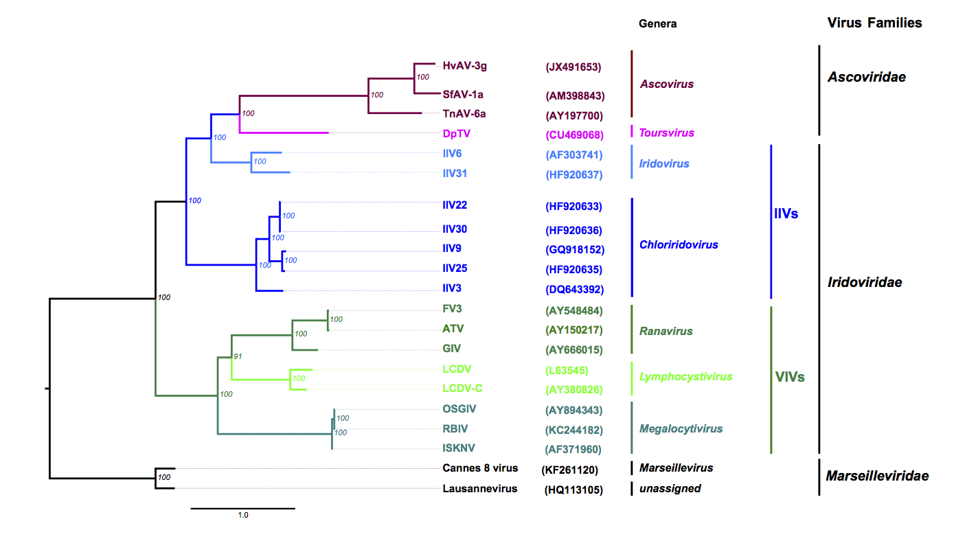 Phylogenetic analyses using nine core genes shared by the members of Ascoviridae, Iridoviridae and Marseilleviridae revealed that all iridoviruses and members of Ascoviridae have evolved from a common ancestor that they share with members of the family Marseilleviridae (Figure 2. Ascoviridae).
