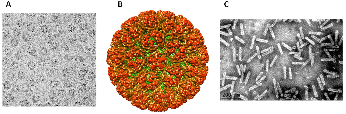 | Figure 1 Caulimoviridae. Negative-contrast electron micrographs of virions of (A) cauliflower mosaic virus and (C) banana streak MY virus. (B) Tridimensional reconstruction of the cauliflower mosaic virus particle (courtesy of Patrick Bron and Andrew D.W. Geering). |