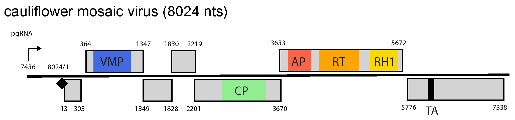 Genomes contain between one and eight ORFs, depending on the genus. The virus-encoded proteins common to all viruses, regardless of the genus they belong to, are a movement protein (MP), a capsid protein (CP), a multipurpose virion-associated protein (VAP), an aspartic protease (AP) and a reverse transcriptase (RT) with tethered RNAse H1 enzyme (Figure 2 Caulimoviridae).