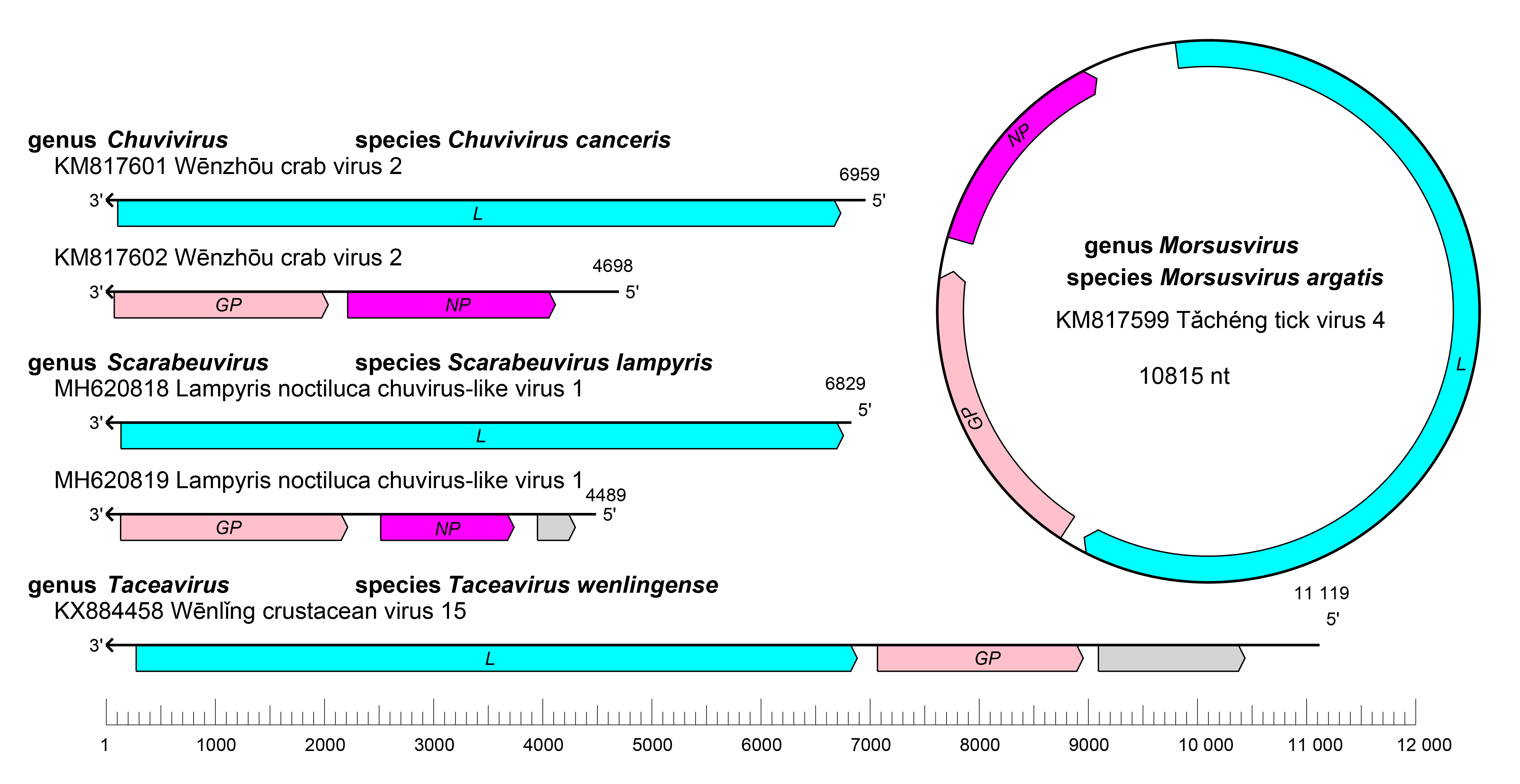 | Figure 1.Chuviridae. Genome organization of four representative viruses in the family Chuviridae. ORFs are colored according to the predicted protein function. GP, glycoprotein gene; NP; nucleoprotein gene; L, large protein gene. Grey color indicates ORFs encoding proteins of unknown function. |