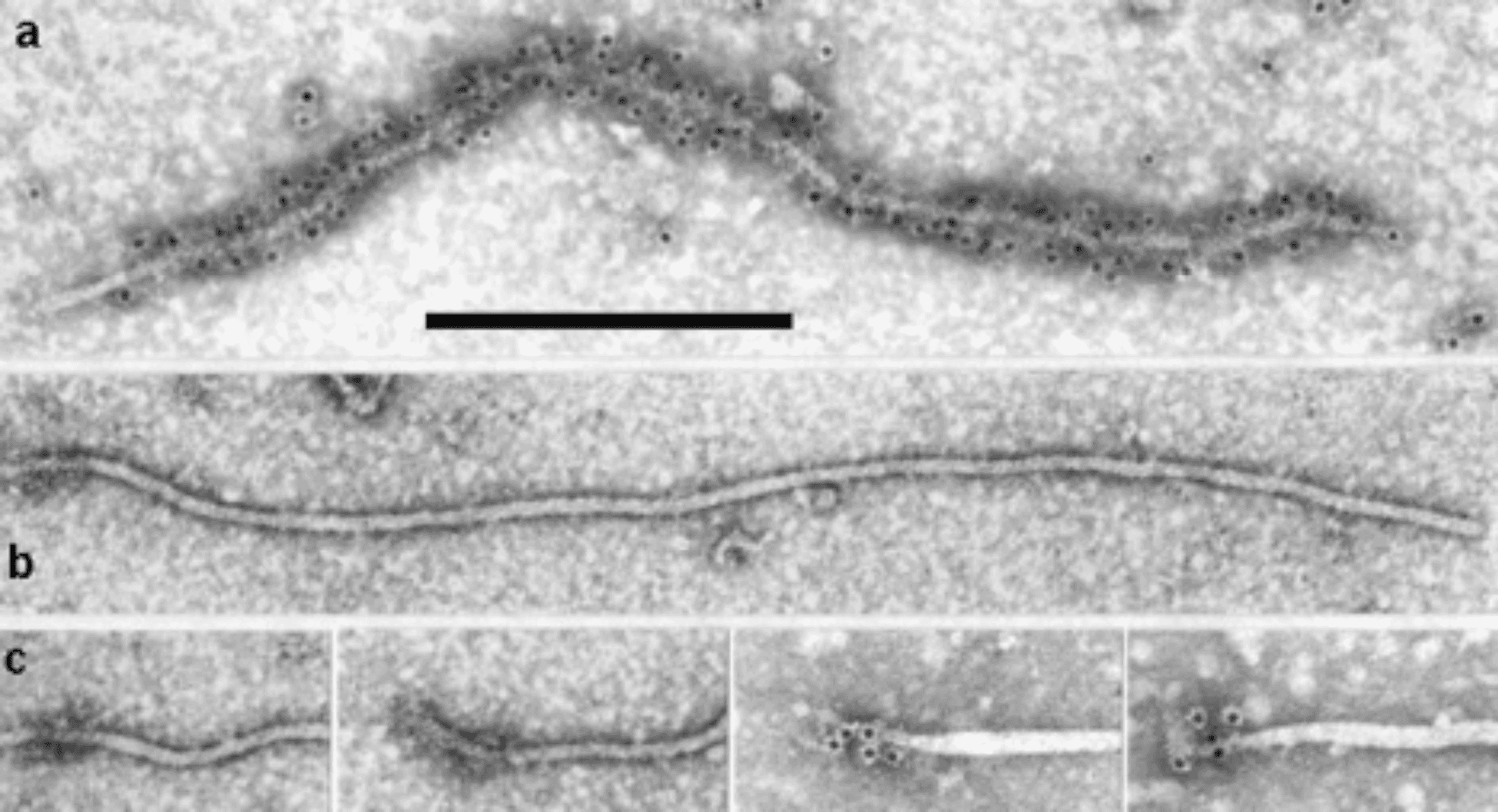 | Figure 2. Closteroviridae. Closterovirus virion structure and organization. Electron micrographs of virions of beet yellows virus (genus Closterovirus) negatively-stained and decorated with an antiserum specific to (a) coat protein (CP; note that the CPm tail is not decorated), and (b) CPm at the 75 nm tail of a virus particle. (c) Close-up of the 75 nm tail of four selected particles decorated with an antiserum specific to CPm. Scale bar represents 300 nm (from (Agranovsky and Lesemann 2000) with permission). |