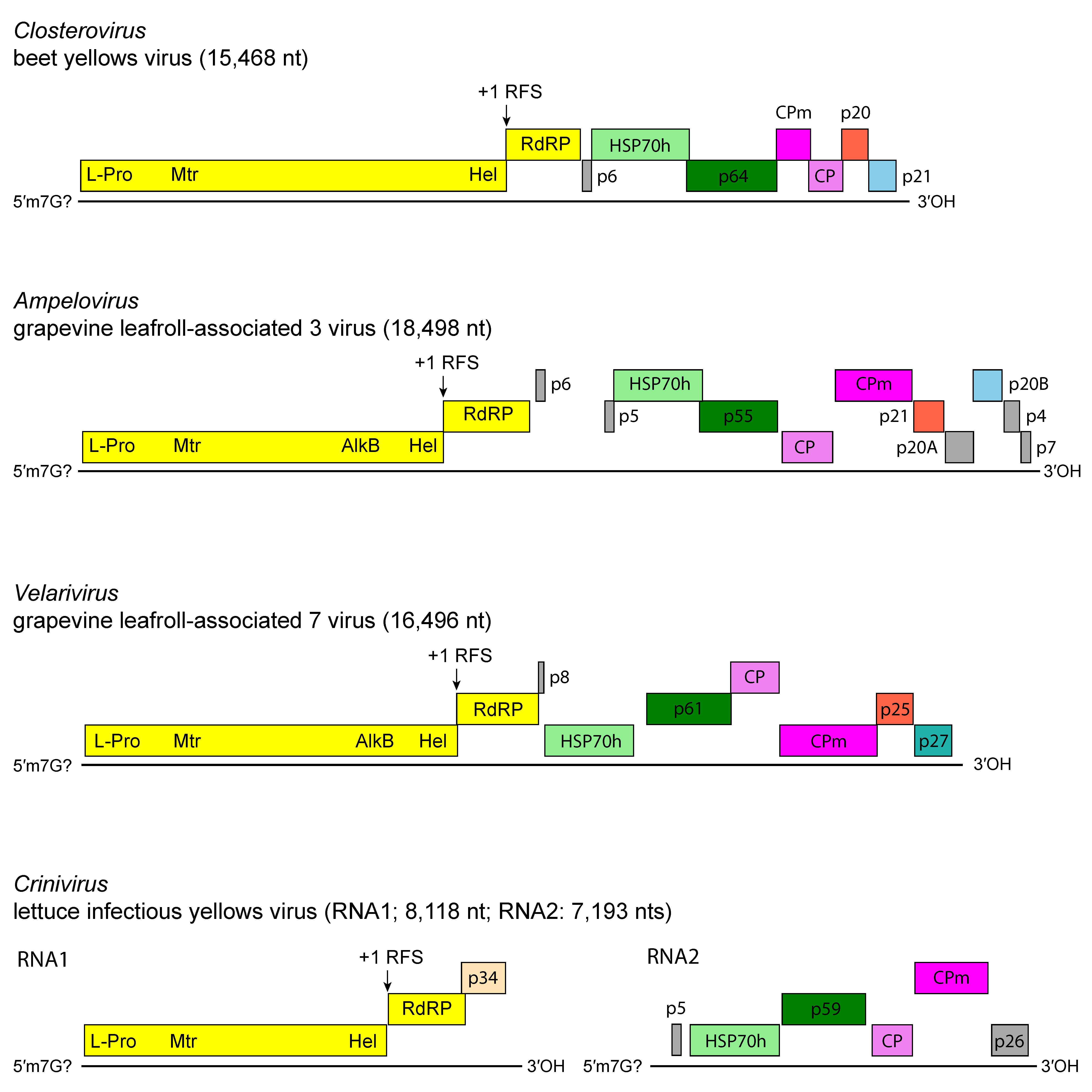 Members of the family have one of the largest genomes among plant viruses, reflecting duplication and the acquisition of nonviral coding sequences (e.g., protease, HSP70 protein) via RNA recombination (Figure 3. Closteroviridae). Recombination may also explain differences in genome organization between members of different genera and members of the same genus (Agranovsky 2016, Dolja et al., 2006, Karasev 2000, Rubio et al., 2013, Ruiz et al., 2018). The complex ORF1a-ORF1b invariably encodes the replication-related proteins, with methyl-transferase (Mtr), helicase (Hel) and RNA-directed RNA polymerase (RdRP) conserved domains. Downstream ORFs, which encode in a 5′ to 3′ direction a 6 kDa small hydrophobic protein, HSP70h, a ~60 kDa protein, CP and CPm, form a five-gene module which is conserved, with few modifications, among most members of the family (Agranovsky 2016, Dolja et al., 2006). The HSP70h and the ~60 kDa proteins are integral virion components present in all members of the family for which the particle structure was studied. The functions postulated for HSP70h include mediation of cell-to-cell movement through plasmodesmata, involvement in the assembly of multi-subunit complexes for genome replication and/or subgenomic RNAs synthesis, and assembly of virus particles (Agranovsky 2016, Dolja et al., 2006). The ~60 kDa protein is required for incorporation of both HSP70h and CPm into virion heads. The duplication of the capsid protein gene seems to be unique among viruses with elongated particles (Agranovsky 2016, Dolja et al., 2006). In general, capsid proteins and their homologs (CPm) show a significant degree of sequence conservation, and the duplicate copies probably retain the general spatial folding and some other crucial properties of the CPs. A notable exception is a group of ampeloviruses with the smallest genomes in the family [e.g. grapevine leafroll-associated virus 4 (GLRaV-4) and related viruses, pineapple mealybug wilt-associated virus 1 (PMWaV-1) and pineapple mealybug wilt-associated virus 3 (PMWaV-3)] which do not appear to possess CPm. For lettuce infectious yellows virus (LIYV), the replication of both genomic RNAs is asynchronous as genomic RNA1 and sub-genomic RNAs (sgRNAs) accumulate before significant accumulation of genomic RNA2 can be detected, suggesting that RNA1 likely replicates in cis while RNA2 replicates in trans. Knockout mutation studies showed that the single-stranded RNA-binding protein p34 that is encoded by RNA1 is a trans enhancer of RNA2 replication (Kiss et al., 2013).