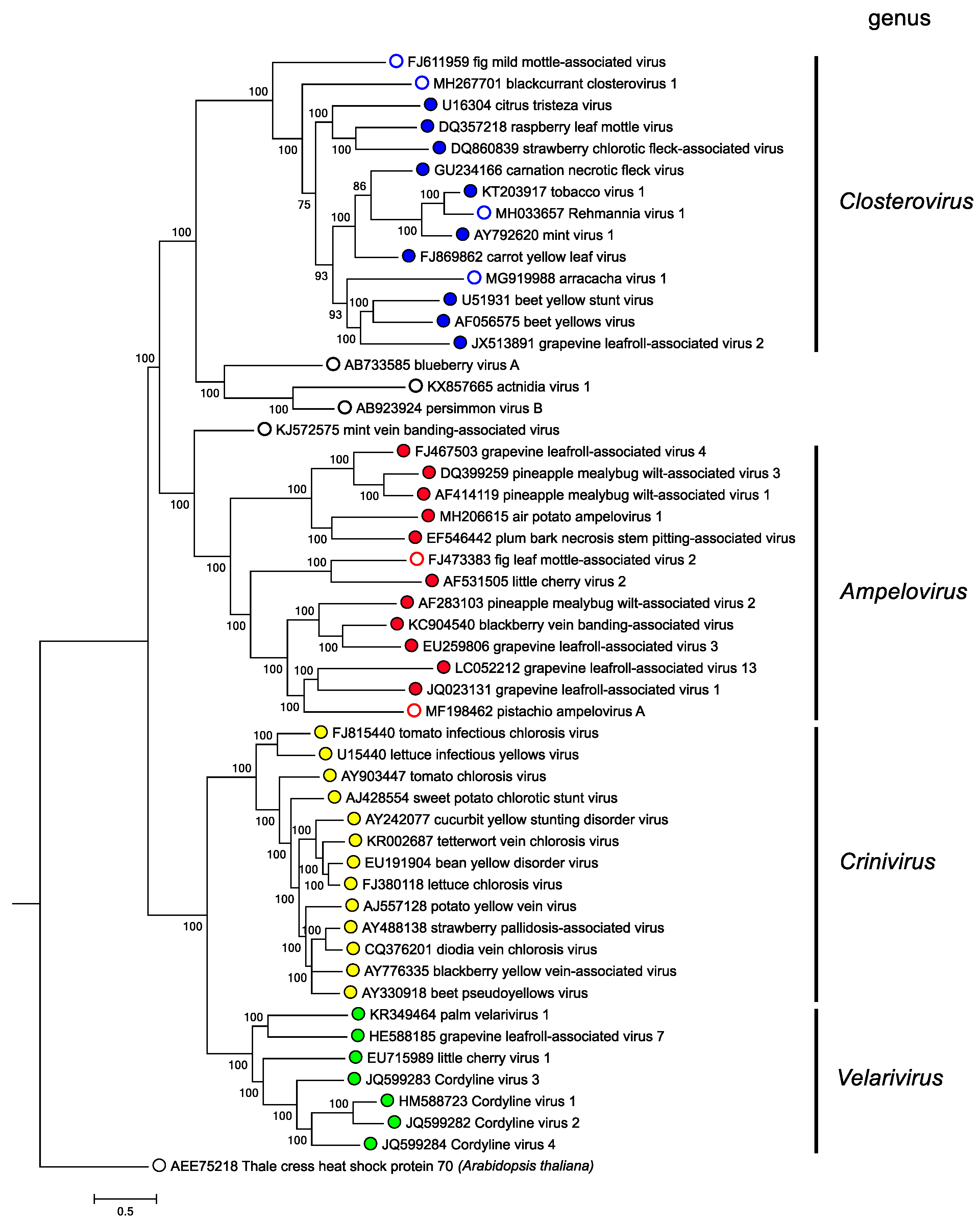 | Figure 4. Closteroviridae. Phylogenetic tree showing the relationships between the species and genera of the family Closteroviridae based on the amino acid sequence of the HSP70h gene. The maximum-likelihood tree was produced and bootstrapped using MUSCLE and inferred using RAxML in the T-REX web server. Branch lengths are proportional to sequence distances, and the bar represents the genetic distance. This phylogenetic tree and corresponding sequence alignment are available to download from the Resources page. |