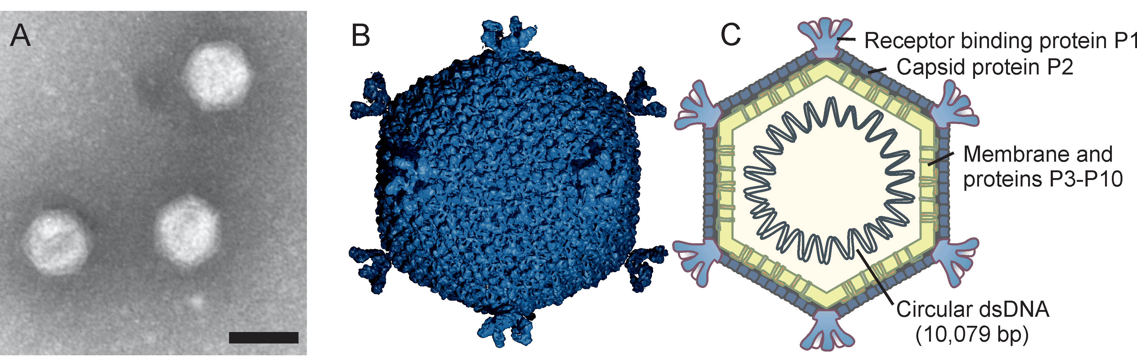 | Virion | Icosahedral, internal membrane-containing virions of about 57 nm with a single capsid protein P2, single spike protein P1 and 8 membrane-associated proteins P3–P10 |