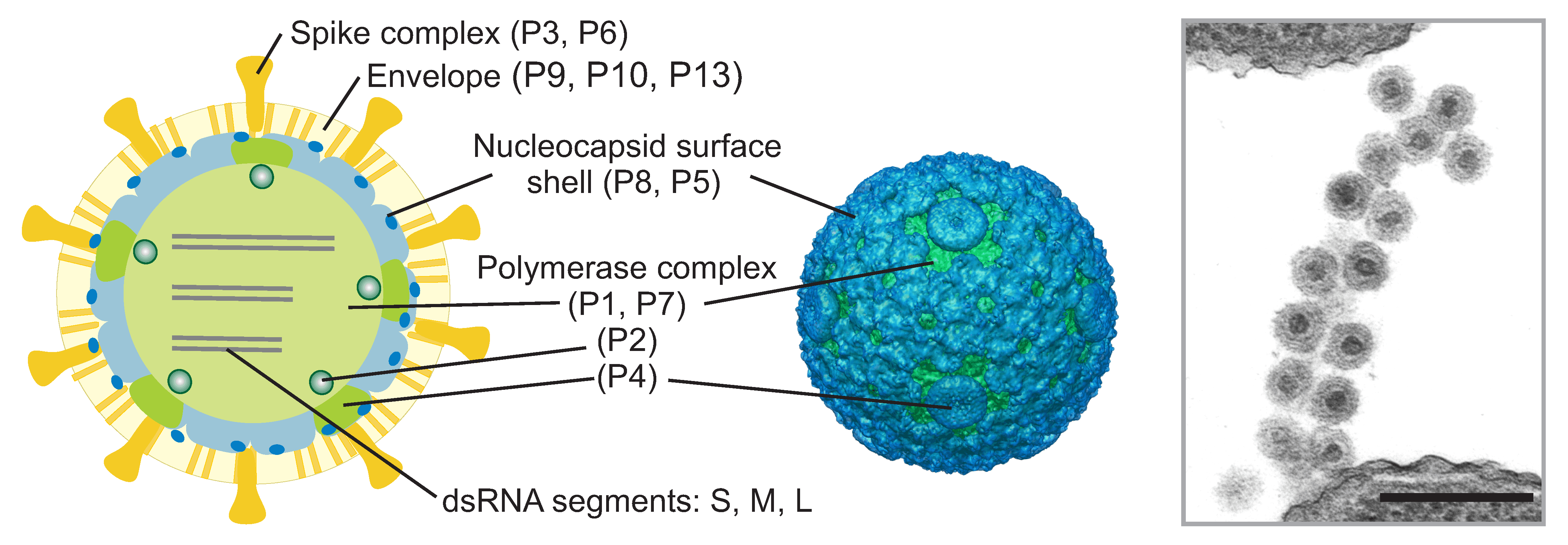 | Virion | Enveloped virions (about 85 nm) with typically two concentric, icosahedrally symmetric protein layers: the nucleocapsid surface shell (T=13) and the polymerase complex core (T=1). Spikes protrude from the virion surface |