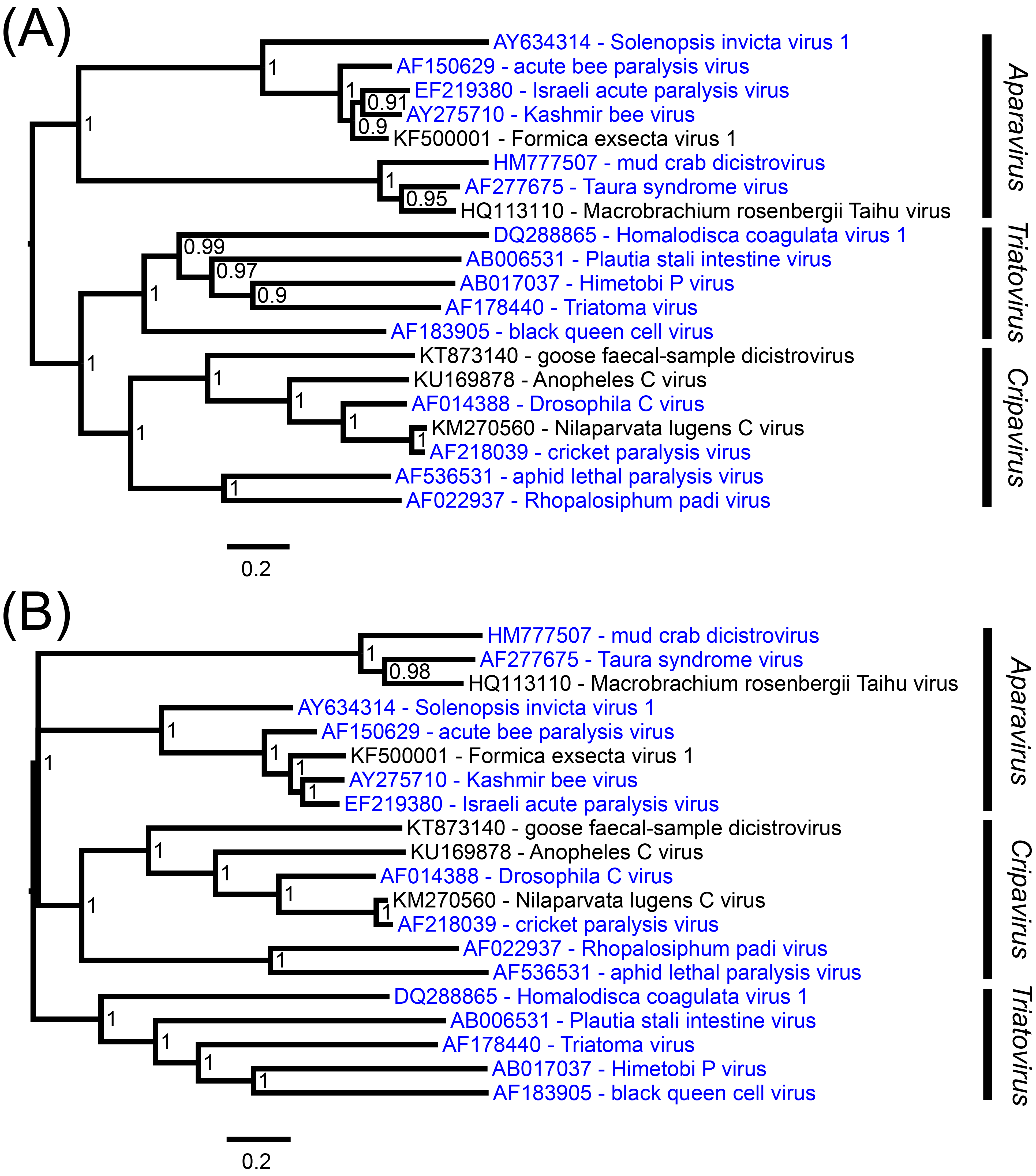 | Figure 3 Dicistroviridae. Mid-point rooted phylogenetic tree constructed from full-length polyprotein amino acid sequences of formally accepted dicistrovirus species and related unclassified virus sequences using MrBayes. While we include metagenome-derived sequences (black text) to provide a more comprehensive phylogeny of the group, we caution that the names given to such sequences are tentative and may not accurately reflect the true host or biology. The currently defined genera are annotated at right and members of the current species are indicated by blue font. (A) Structural polyprotein tree. (B) Nonstructural polyprotein tree. Node labels indicate posterior probabilities. These phylogenetic trees and corresponding sequence alignments are available to download from the Resources page. |