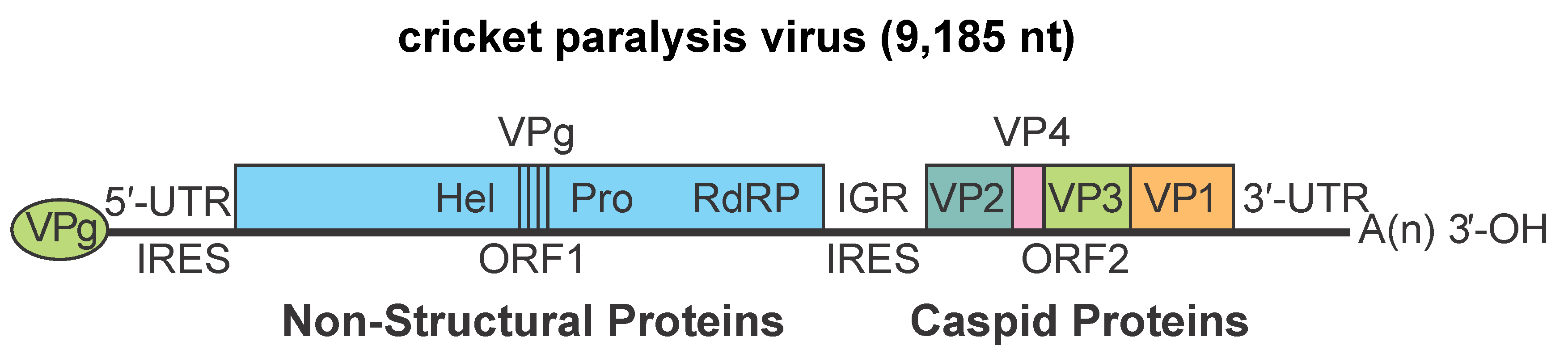 Virions contain a single molecule of infectious, linear, positive-sense, single-stranded RNA of approximately 8–10 kilobases with a GC content ranging from 34 to 45%. RNA constitutes 34% (median) of the virion mass. A small genome-linked virus protein (VPg), is covalently attached to the 5′-end of the genome. A 5′-non coding region (NCR) is followed by two non-overlapping open reading frames (ORF 1 and ORF 2) of approximately 5,500 and 2,700 nucleotides, respectively. The ORFs are separated by an intergenic untranslated region (IGR) of about 170–530 nucleotides that contains an internal ribosome entry site (IRES). An NCR is also found at the 3′-end of the genome. The 3′-terminus of the viral RNA genome is polyadenylated. The length of the NCRs at each end of the genome is variable. A clone of the cricket paralysis virus has been produced and found to be infectious (Kerr et al., 2015).