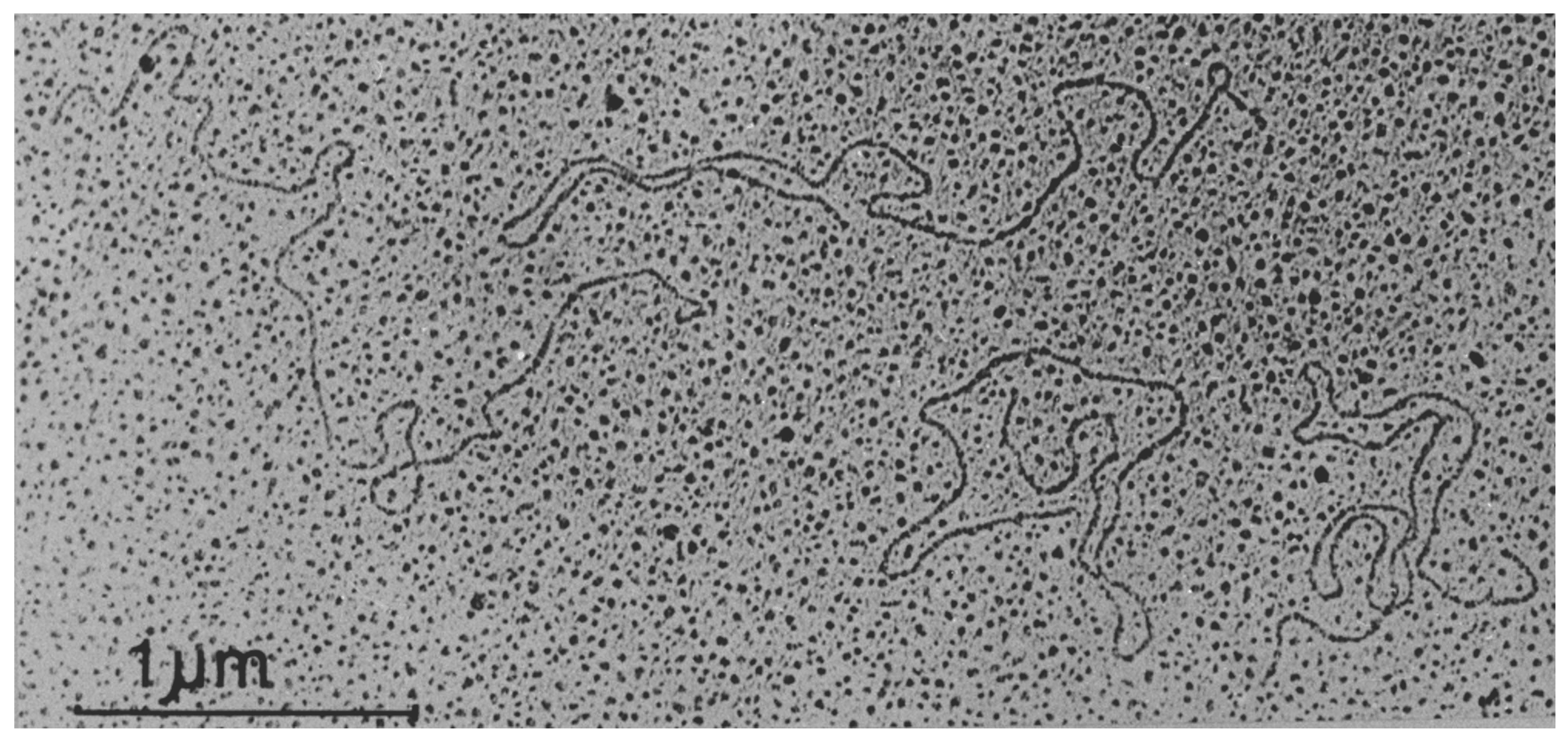 | Figure 1. Endornaviridae. Transmission electron micrograph of dsRNA molecules of Oryza sativa endornavirus isolate Nipponbare. Figure reproduced with permission (Fukuhara et al., 1993). Bar represents 1 µm. |