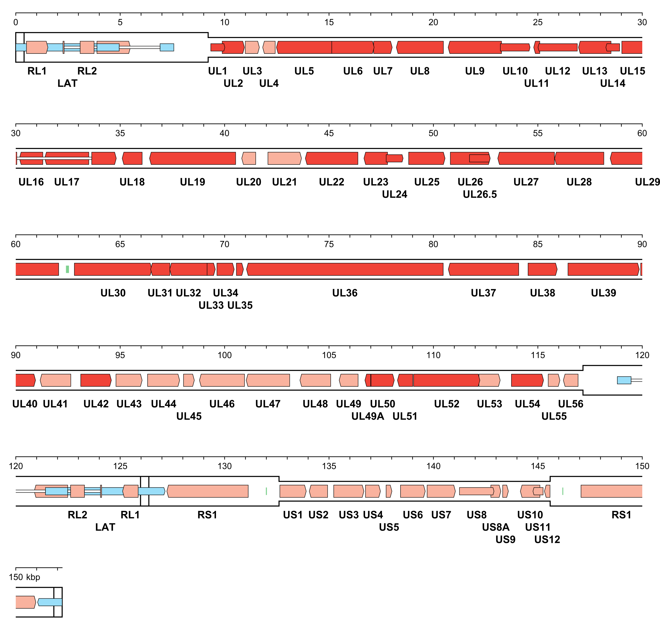 | Figure 3.Orthoherpesviridae. Genetic organisation of herpes simplex virus 1 strain 17 (JN555585, subfamily Alphaherpesvirinae). The inverted repeats (TRL, IRL, IRS and TRS, including a and a’) are shown in a thicker format than the unique regions (UL and US) (see Figure 2.Orthoherpesviridae for the relative arrangements of these regions in this class 4 genome). Functional protein-coding regions are indicated by open, coloured arrows, with bright red indicating genes shared with members of the other subfamilies and light red indicating other genes; gene nomenclature is shown below. Some protein-coding regions are designated by narrower coloured arrows merely to make their locations clearer. A noncoding RNA (the latency-associated transcript, LAT) mapping in two locations (one of which includes sequences near both genome termini) is indicated as narrower, blue-shaded arrows. Introns connecting protein-coding regions or LAT exons are shown as narrow white bars. Three origins of DNA replication are shown as green bars. |