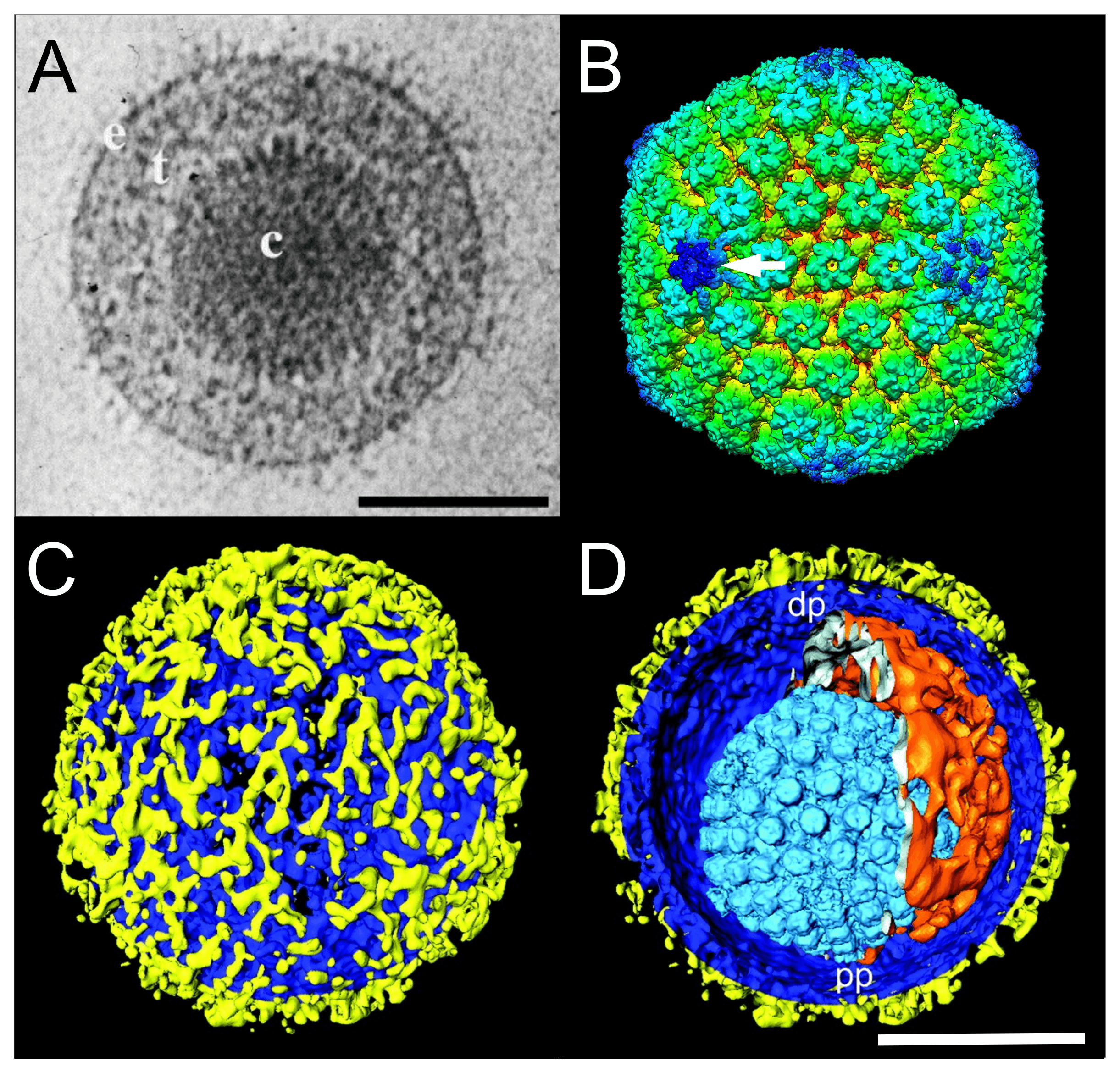 | Figure 1.Orthoherpesviridae. Virion and capsid structure. (A) Cryo-electron microscopy image of a single herpes simplex virus 1 (HSV1) virion. The capsid (c) is embedded in the tegument (t) and enclosed by a lipid envelope containing glycoproteins (e). Scale bar, 100 nm. From (McGeoch et al., 2006) with permission. (B) Three-dimensional cryo-electron microscopy image reconstruction of a single HSV1 capsid indicating the unique portal-vertex by a white arrow. From (McElwee et al., 2018). (C and D) Segmented surface rendering of a single HSV1 virion tomogram after denoising. From (Grünewald et al., 2003) with permission. (C) Outer surface showing the distribution of glycoprotein spikes (yellow) protruding from the membrane (blue). (D) Cutaway view of the virion interior, showing the capsid (light blue) and the asymmetric tegument cap (orange) inside the envelope (blue and yellow). pp, proximal pole; dp, distal pole. Scale bar, 100 nm. |