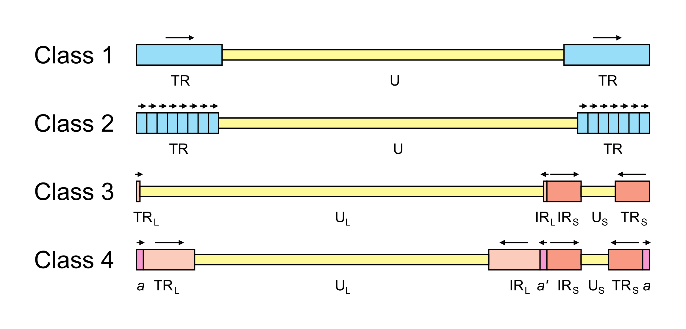| Figure 2.Orthoherpesviridae. Major classes of orthoherpesvirus genome architecture. In this simplified, not-to-scale illustration, unique and repeated sequences are shown in thinner and thicker format, respectively. The nomenclature used to describe these sequences is U (unique), UL (long unique), US (short unique), TR (terminal repeat), TRL (terminal long repeat), IRL (internal long repeat), TRS (terminal short repeat) and IRS (internal short repeat). Class 4 genomes contain a terminal direct repeat (a) that is also present internally in inverse orientation (a’); formally, a is part of both TRL and TRS, and a’ is part of both IRL and IRS. Unique sequences are shaded yellow, direct repeats are shaded blue, inverted repeats are shaded red and a and a’ are shaded pink. The orientations of repeated sequences are shown by arrows. Further details and examples of viruses belonging to each class are provided in the text of this section. |