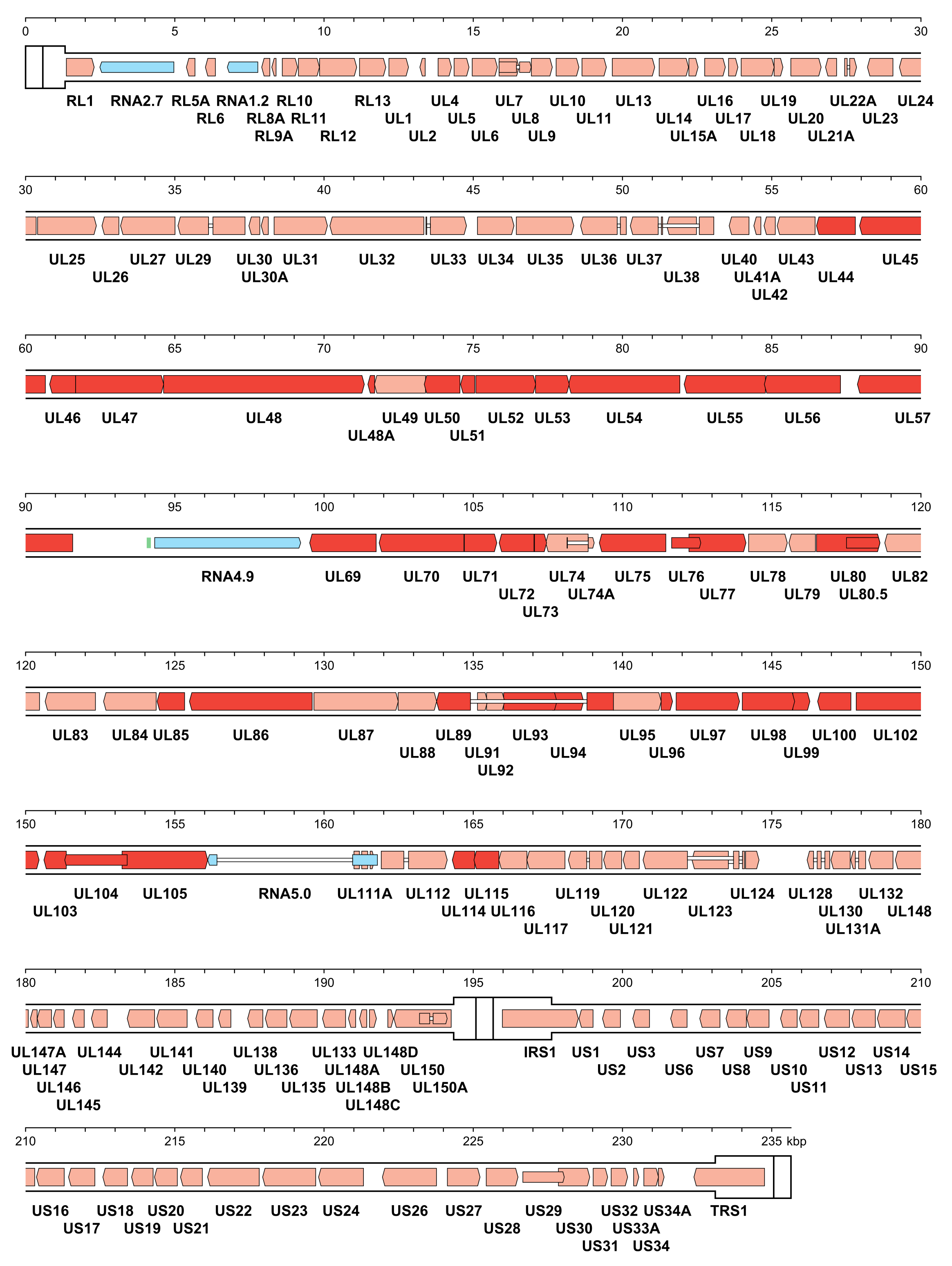 | Figure 4.Orthoherpesviridae. Genetic organisation of human cytomegalovirus strain Merlin (AY446894, subfamily Betaherpesvirinae). The inverted repeats (TRL, IRL, IRS and TRS, including a and a’) are shown in a thicker format than the unique regions (UL and US) (see Figure 2.Orthoherpesviridae for the relative arrangements of these regions in this class 4 genome). Functional protein-coding regions are indicated by open, coloured arrows, with bright red indicating genes shared with members of the other subfamilies and light red indicating other genes; gene nomenclature is shown below. Some protein-coding regions are designated by narrower coloured arrows merely to make their locations clearer. Noncoding RNAs (RNA2.7, RNA1.2, RNA4.9 and RNA5.0) are indicated as narrower, blue-shaded arrows. Introns connecting protein-coding regions or RNA5.0 exons are shown as narrow white bars. An origin of DNA replication is shown as a green bar. |
