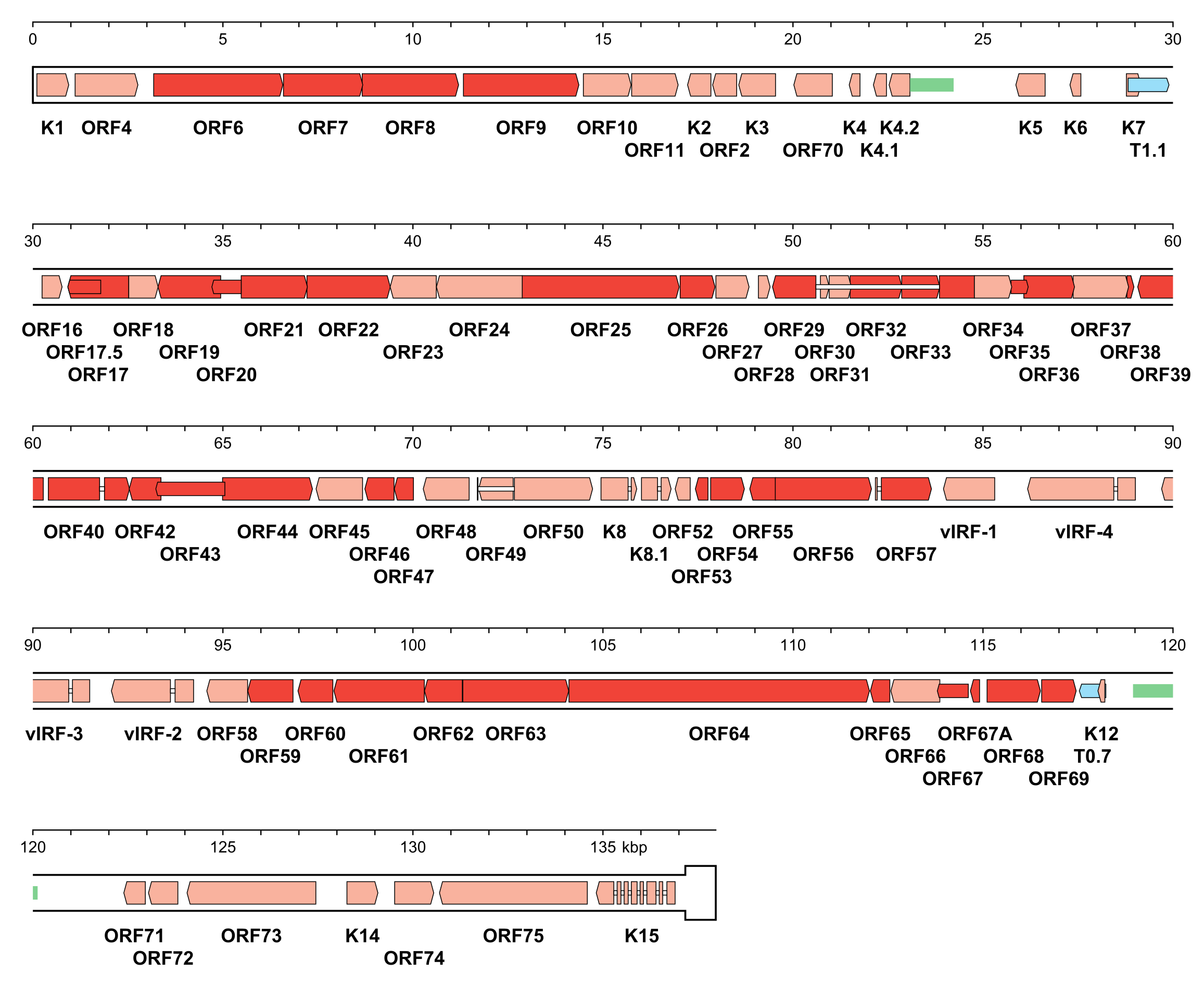 | Figure 5.Orthoherpesviridae. Genetic organisation of Kaposi's sarcoma-associated herpesvirus strain GK18 (AF148805, subfamily Gammaherpesvirinae). The genome is depicted as the unique region (U) followed by a single copy of the terminal direct repeat (TR) in a thicker format. In genomic DNA, U is flanked on each side by variable numbers of TR, with the number of copies totalling 35–45, giving a genome length of approximately 170 kbp in this class 2 genome. Functional protein-coding regions are indicated by open, coloured arrows, with bright red indicating genes shared with members of the other subfamilies and light red indicating other genes; gene nomenclature is shown below. Some protein-coding regions are designated by narrower coloured arrows merely to make their locations clearer. Noncoding RNAs (T1.1 and T0.7) are indicated as narrower, blue-shaded arrows. Introns connecting protein-coding regions are shown as narrow white bars. Inverted repeats that may be associated with two origins of DNA replication are shown as green bars. |