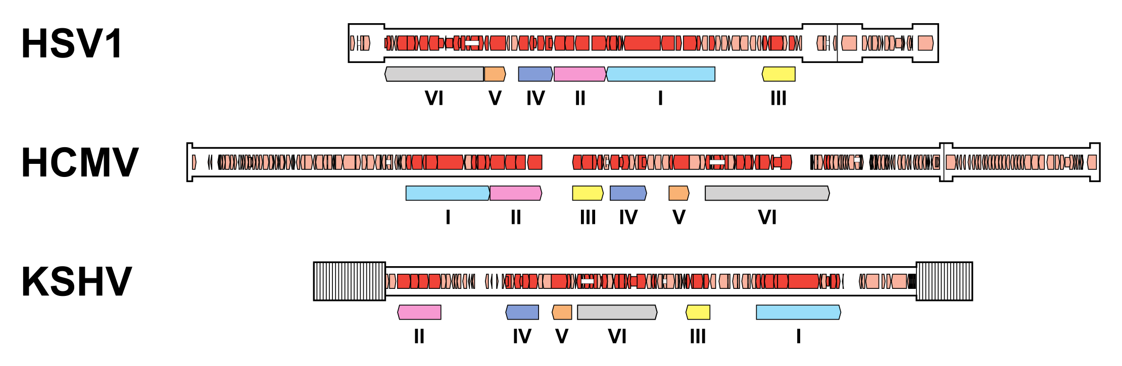 | Figure 6.Orthoherpesviridae. Organisation of conserved gene blocks in human herpesviruses representing the three subfamilies. The genomes illustrated are those of herpes simplex virus 1 strain 17 (HSV1; JN555585, subfamily Alphaherpesvirinae), human cytomegalovirus strain Merlin (HCMV; AY446894, subfamily Betaherpesvirinae) and Kaposi's sarcoma-associated herpesvirus strain GK18 (KSHV; AF148805, subfamily Gammaherpesvirinae). The conserved gene blocks (I-VI) are indicated by open, coloured arrows below the genomes, and are ordered relative to their arrangement in HCMV. Direct or inverted repeats are shown in a thicker format than unique regions. Functional protein-coding regions are indicated by open, coloured arrows, with bright red indicating genes shared with members of the other subfamilies and light red indicating other genes. Some protein-coding regions are designated by narrower coloured arrows merely to make their locations clearer. Introns connecting protein-coding regions are shown as narrow white bars. |