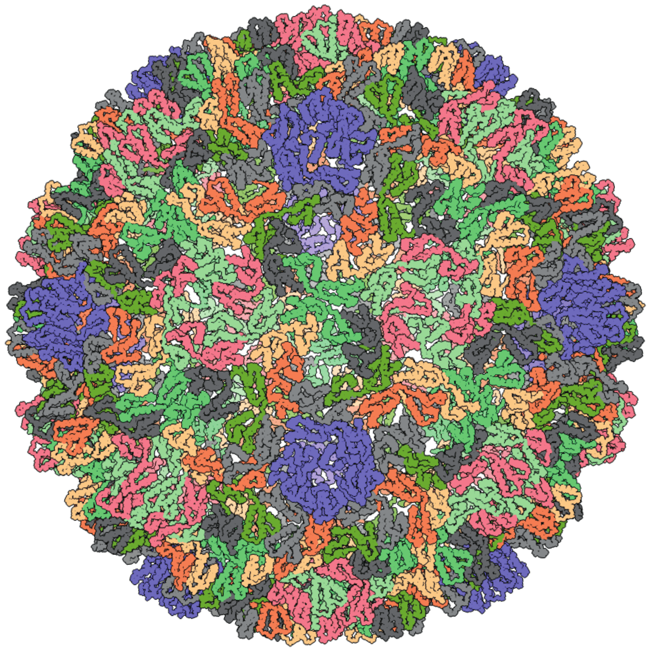 | Figure 1. . Metaviridae. Three-dimensional reconstruction of the Saccharomyces cerevisiae Ty3 virus (SceTy3V) virus like particle; both immature and mature particles have the same external radius of about 21 nm, corresponding to a true radius of about 25 nm corresponding to a true diameter of about 47 nm. PDB id: 6R24 (Dodonova et al., 2019). |