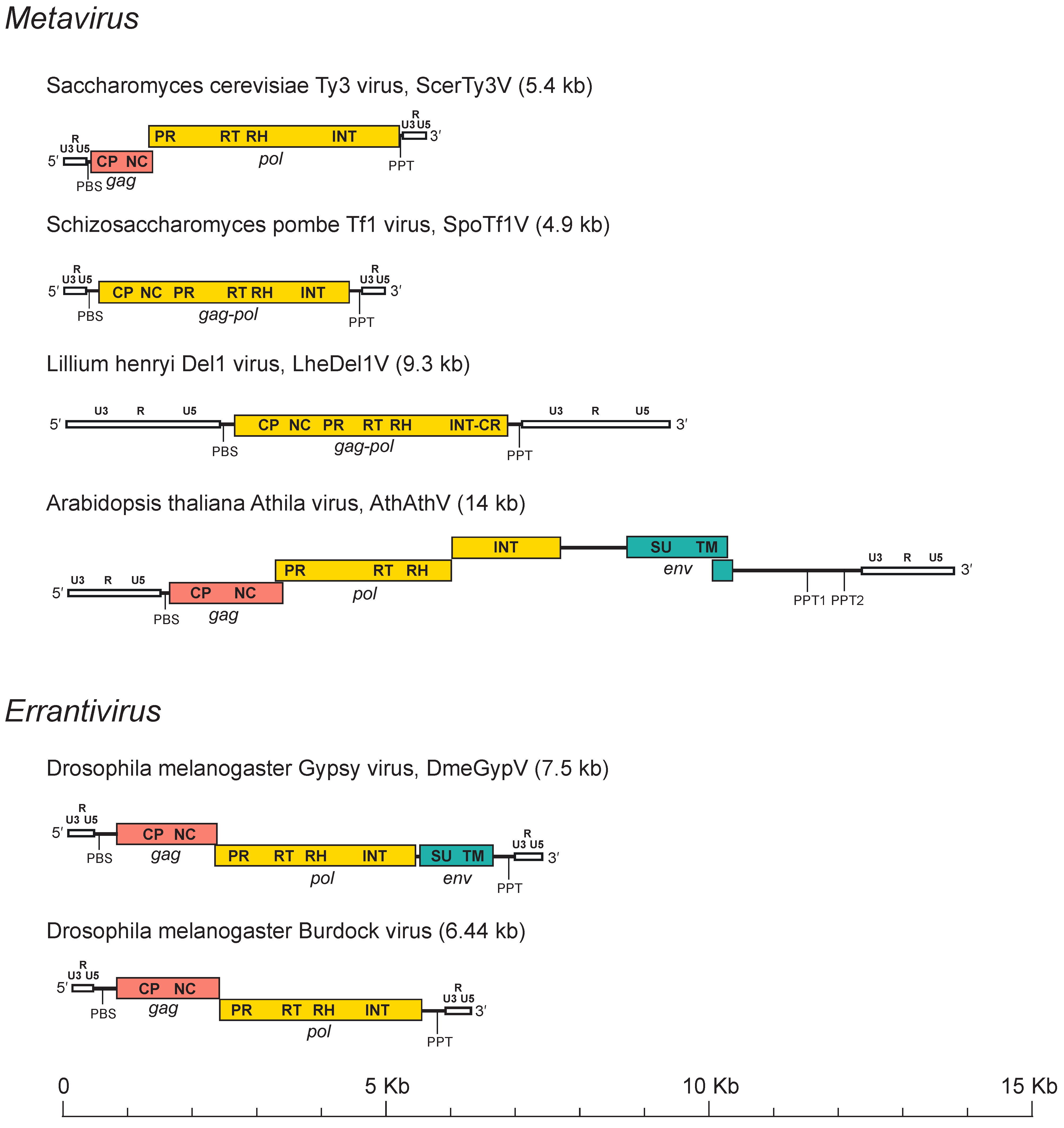 | Figure 2. . Metaviridae. Metavirus genome structure. Long terminal repeats (white) are labelled with the U3, R and U5 regions. Other labels are PBS (primer binding site), PPT (polypurine tract), gag (pink) with its capsid (CP) and nucleocapsid (NC) domains, pol (yellow) with its protease (PR), reverse transcriptase (RT), ribonuclease H (RH) and integrase(INT) domains, and env (blue-green) with its surface (SU) and transmembrane (TM) domains. |