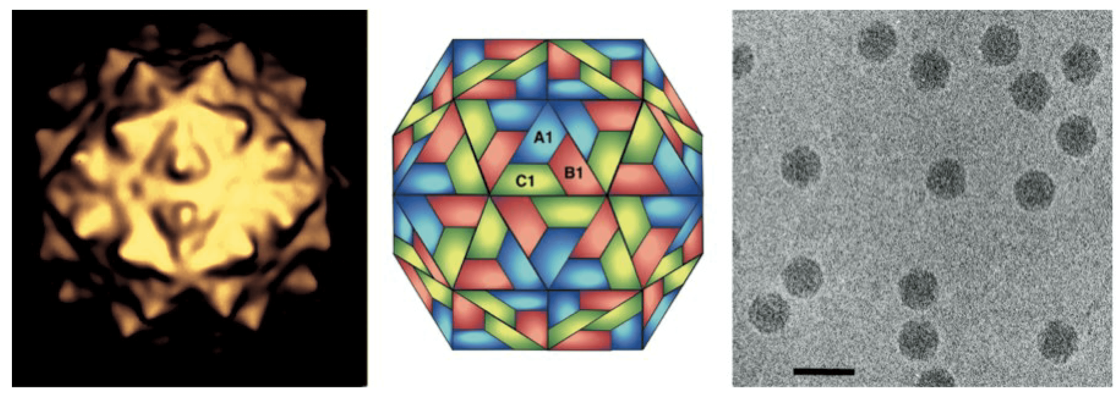 | Figure 1. Nodaviridae. Flock House virus particles. (Left) Image reconstruction, (Center) schematic representation of a T=3 icosahedral lattice, A1, B1 and C1 indicate three different quasi-equivalent copies of the capsid protein, (Right) cryo-electron micrograph; the bar represents 50 nm. (Courtesy of N. Olson and T. Baker.) |