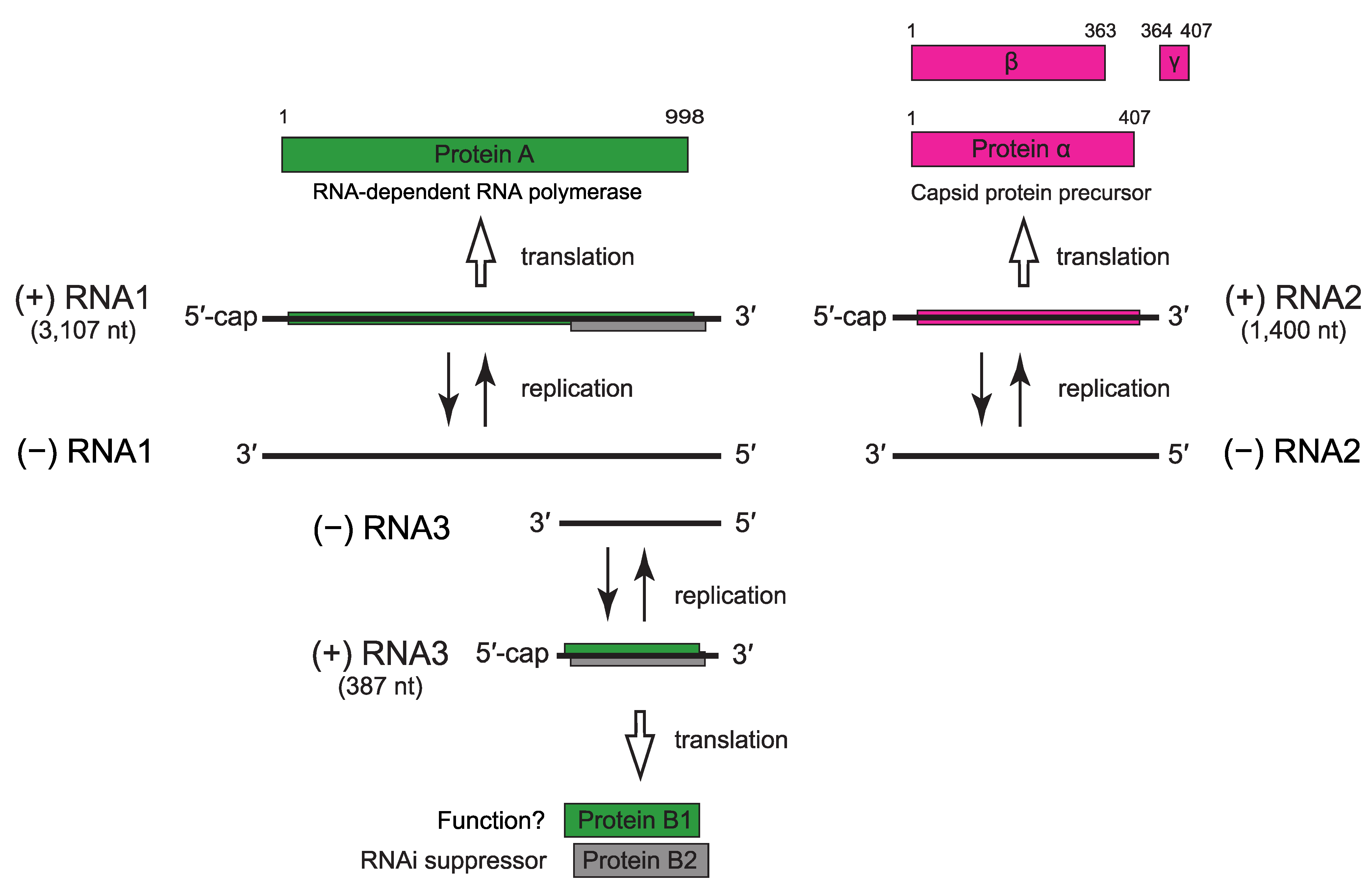 | Genome | Bi-partite positive-sense, ssRNA of 3.1 kb (RNA1) and 1.4 kb (RNA2) with 5ʹ-terminal caps but without poly(A) tails |