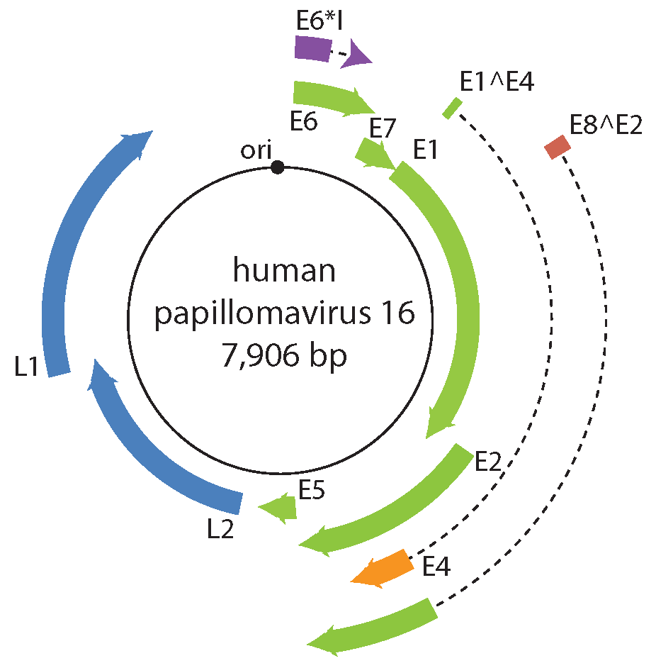 Figure 2. . Papillomaviridae.  (B) Diagram of the human papillomavirus 16 genome. The viral dsDNA is indicated. The outer boxes indicate the protein-coding open reading frames. Dotted lines represent intron sequences. The black circle represents the viral origin of replication (ori).