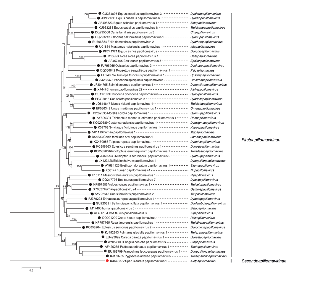 Figure 4. . Papillomaviridae.  Phylogenetic analysis of isolates from the type species of each papillomavirus genus. The E1, E2, L2, and L1 nucleotide sequences were translated into amino acids and aligned using MUSCLE v7.221 (Edgar 2004). A maximium likelihood tree of concatenated nucleotide sequences was produced using the optimal model of evolution (GTR + G) as determined within MEGA 7 (Kumar et al., 2016). Nodes supported by >70% of bootstrap replicates are indicated. This phylogenetic tree and corresponding sequence alignment are available to download from the Resources page, along with a complete tree including an additional 290 isolates.