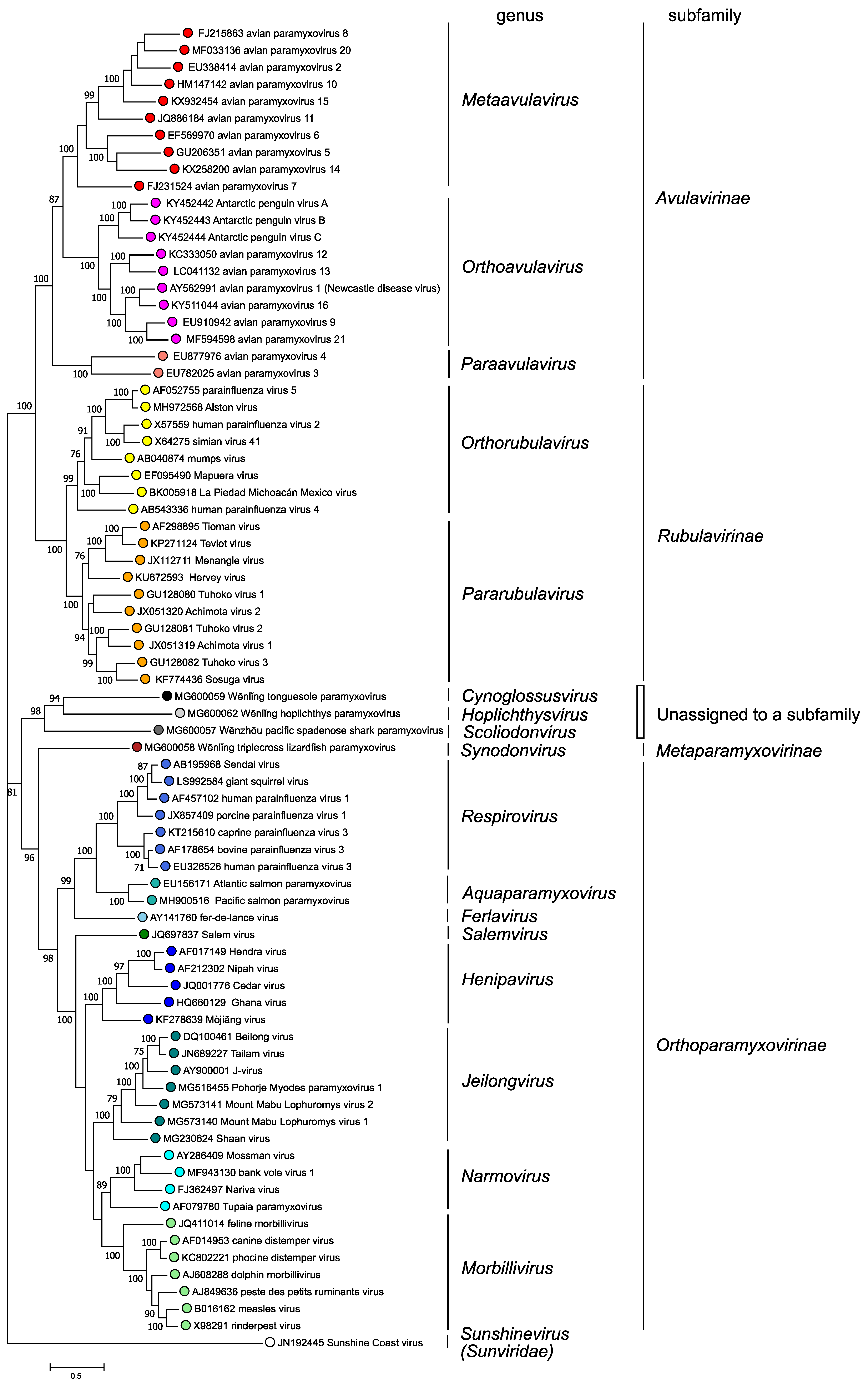 Phylogenetic analysis of complete L protein amino acid sequences (Figure 3. Paramyxoviridae) supports the classification of paramyxoviruses into four subfamilies and fourteen genera based on genetic distances; in addition, three viruses are members of species that are not assigned to a genus or subfamily