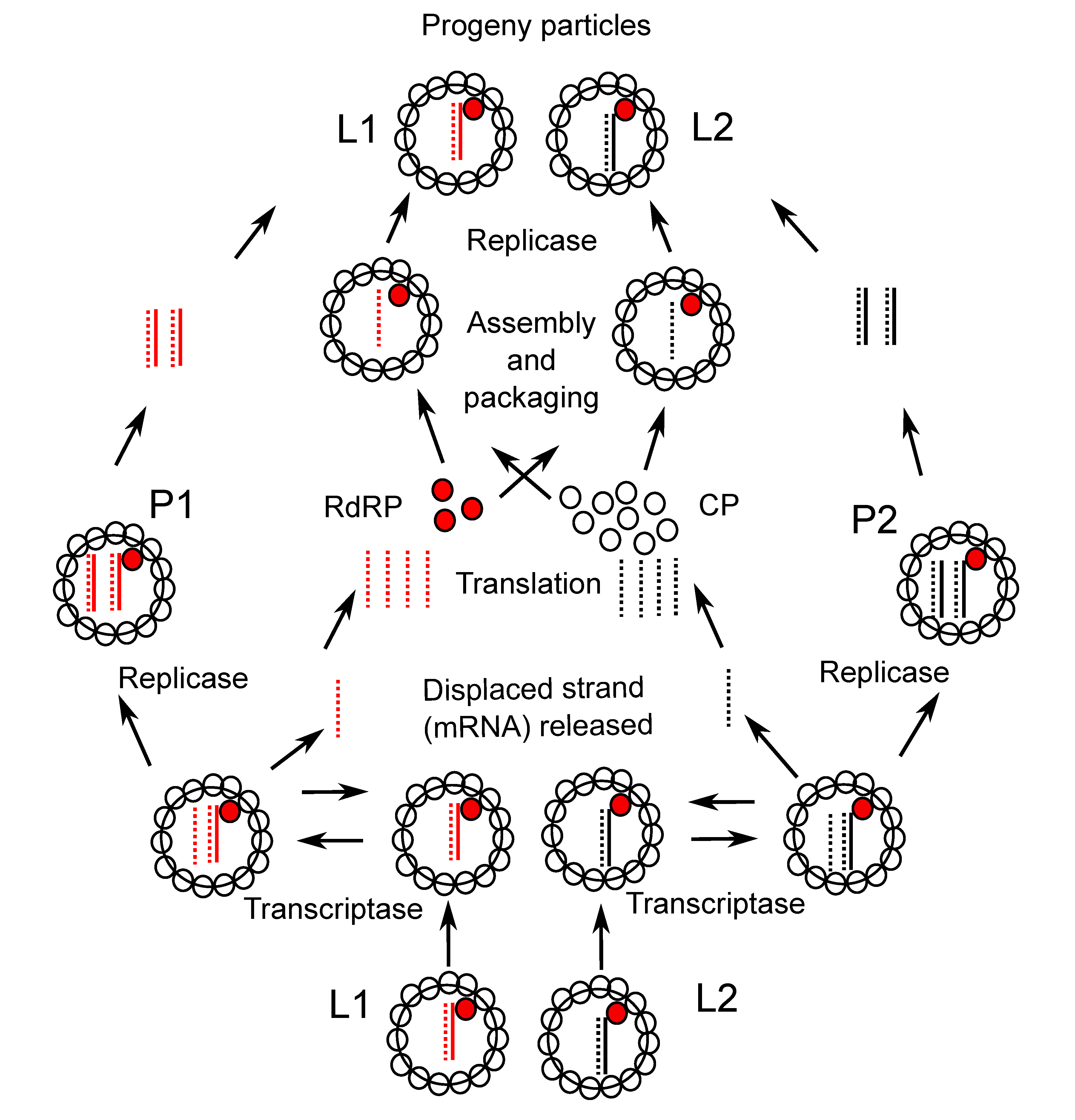 | Figure 3. Partitiviridae. Model for replication of Penicillium stoloniferum virus S (PsV-S). Virion particles contain one or two copies of RdRP (red circles), 120 copies of CP (open circles) and a dsRNA encoding either RdRP (L1, red lines) or CP (L2, black lines). Positive-strands are indicated by dashes and negative-strands by solid lines. Within each particle the RdRP mediates positive-strand RNA synthesis using the negative-strand of the genome dsRNA as a template. The newly synthesized positive-strand RNA is retained inside the particle as part of the dsRNA while the parental genomic positive-strand (encoding RdRP or CP) is released from the particle and used in translation by cellular ribosomes or in packaging into a new partitivirus particle. The RdRP is believed to function also as a replicase by catalyzing the synthesis of negative-strand RNA on the positive-strand template within the assembling virion, thereby reconstituting a genomic dsRNA segment. Also indicated is a proposed pathway leading to the production of L1 and L2 particles via P1 and P2 particles that contain two copies of a dsRNA segment (Buck 1978). |