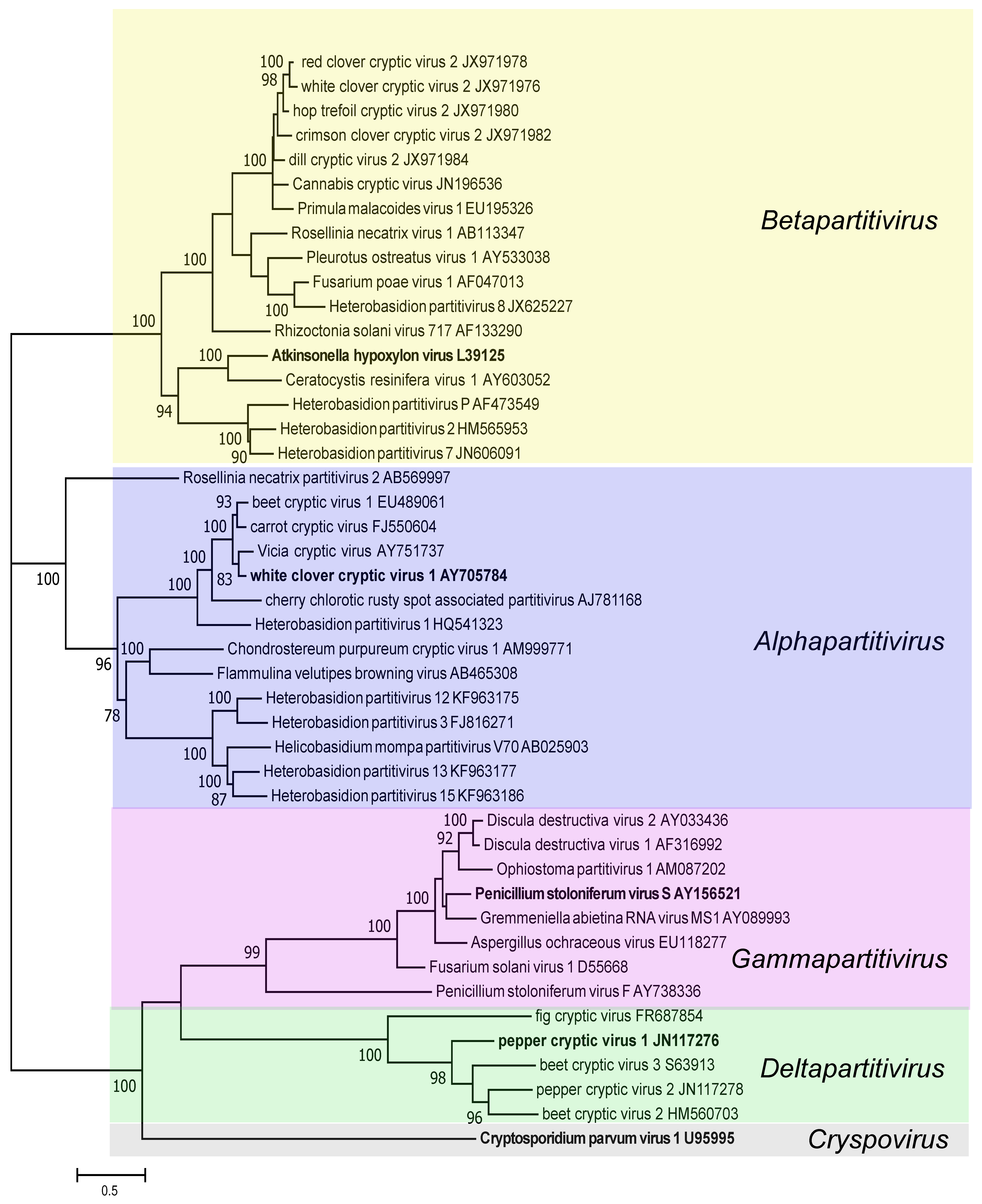 Phylogenetic analysis based on amino acid sequences of RdRPs of members of the family Partitiviridae led to the identification of five clusters corresponding to the five partitivirus genera (Figure 4 Partitiviridae). Within the genus Betapartitivirus, the plant viruses constitute a highly supported subclade distinct from fungal betapartitiviruses. Similarly, classified plant viruses in the genus Alphapartitivirus form a distinct subcluster among fungal alphapartitiviruses. (Nibert et al., 2014). The three remaining partitivirus genera form three distinct clades that appear to be specific to plants (genus Deltapartitivirus), fungi (genus Gammapartitivirus) and protozoa (genus Cryspovirus).