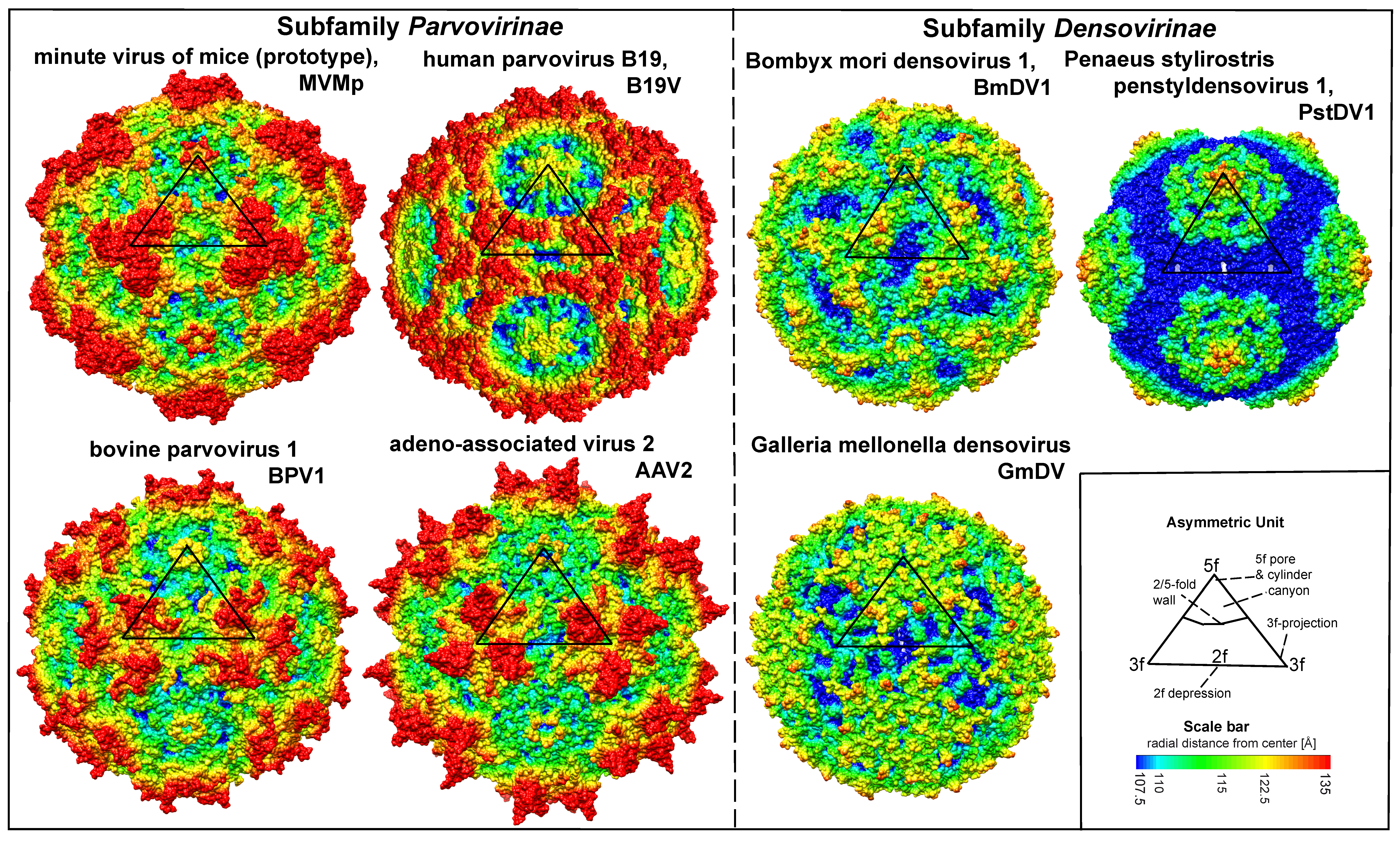 | Figure 1. Parvoviridae. Surface images showing capsid topologies of viruses from selected genera in subfamilies Parvovirinae and Densovirinae. Radial distances from the particle centre are colour coded (blue to red), as indicated on scale bar. An asymmetric unit diagram is labelled to indicate icosahedral 2-, 3- and 5- fold axes and the 2/5-fold wall. The position of a single asymmetric unit is indicated on each model. Atomic co-ordinates were obtained as follows: minute virus of mice (prototype) (Protoparvovirus, PDB ID 1Z14) (Kontou et al., 2005, Agbandje-McKenna et al., 1998), human parvovirus B19 (Erythroparvovirus, PDB ID 1S58) (Kaufmann et al., 2004), bovine parvovirus 1 (Bocaparvovirus, PDB 4QC8) (Kailasan et al., 2015b), adeno-associated virus 2 (Dependoparvovirus, PDB 1LP3) (Wigfield and Eatock 1990), Bombyx mori densovirus 1 (Iteradensovirus, PDB ID 3POS) (Kaufmann et al., 2011), Penaeus stylirostris penstyldensovirus 1 (Penstyldensovirus, PDB 3N7X) (Kaufmann et al., 2010), Galleria mellonella densovirus (Ambidensovirus, PDB 1DNV) (Simpson et al., 1998). Figures were generated using the program Chimera (Pettersen et al., 2004). |