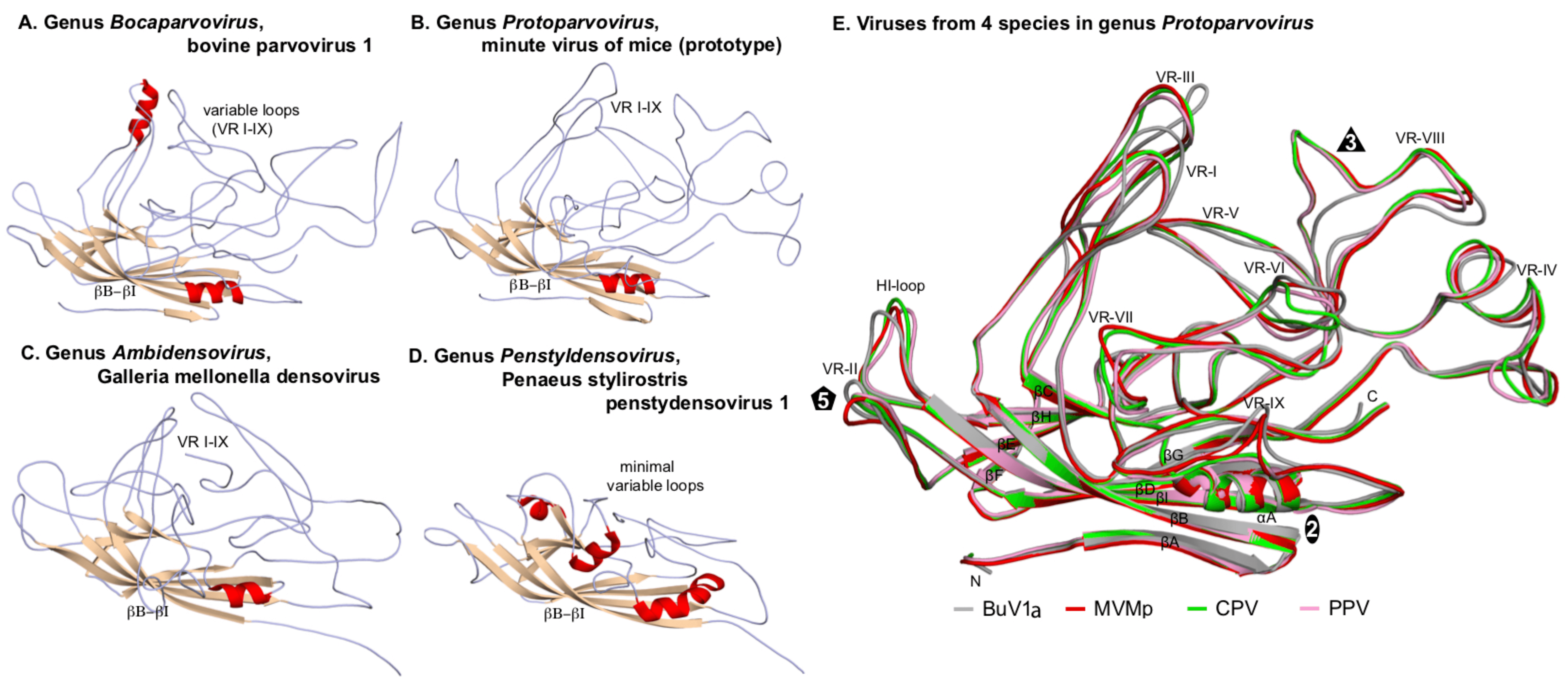Each VP chain forms a core beta-barrel structure of at least 8 strands (labelled βB–βI in Figure 2. Parvoviridae) arranged as two adjacent beta sheets (that spell CHEF and BIDG, see Figure 2E. Parvoviridae), with the BIDG sheet forming the inner surface of the capsid shell. Individual beta strands are linked by loops of variable length, sequence, and conformation, most of which project towards the outer surface of the capsid and give individual viruses their unique surface topology. The apices of these loops are the most varied and defined as variable regions (VRs). Although these monomer structures can differ widely between members of different genera (cf. Figure 2. Parvoviridae A–D), for viruses within a genus they are typically highly conserved. This is illustrated for members of genus Protoparvovirus in Figure 2E. Parvoviridae, where the Cα positions of the core secondary structure elements (β sheets A–I and helix A) of viruses from 4 different species are completely superimposed, and even the variable loops between these conserved structures follow very similar topologies (Figure 2E. Parvoviridae) (Ilyas et al., 2018). Thus in general, parvovirus capsid structures are significantly more conserved than their protein sequence identities suggest: for example, the capsid amino acids of minute virus of mice (prototype, MVMp) and porcine parvovirus (PPV) share around 52% sequence identity, but 97% of their alpha carbons occupy similar positions (Figure 2E. Parvoviridae), and even between PPV and the insect virus Galleria mellonella densovirus (GmDV, genus Ambidensovirus; cf. Figure 2. Parvoviridae C and E), 40% of capsid residues align despite sharing only 9% sequence identity. Accordingly, capsid structures serve as a strong indicator of parvovirus phylogenetic identity.