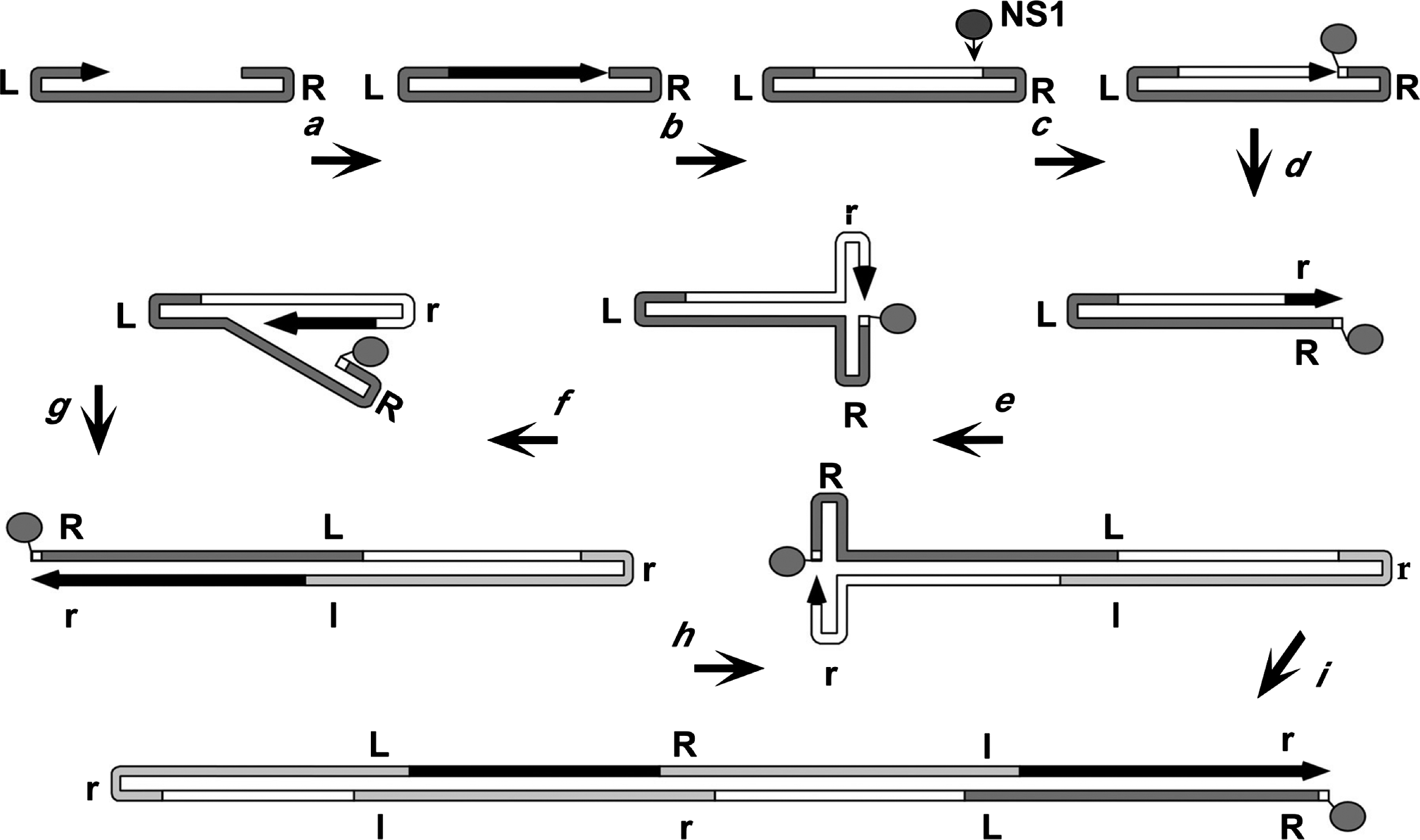 Figure 4. Parvoviridae illustrates how the unfolding and refolding of the terminal hairpins of a heterotelomeric virus, such as MVM, generates monomeric and concatemeric duplex intermediates. In step a, the base-paired 3′-nucleotide of the 3′-hairpin primes conversion of virion DNA to the first duplex intermediate. This generates a monomer-length duplex molecule in which the two strands are covalently continuous at the viral 3′-telomere. This serves as the first viral transcription template, allowing expression of NS1. Before NS1 accumulates, replication cannot proceed beyond the position indicated in step a), and the 3′-end of the new strand may become ligated to the original 5′-end (step b), creating a covalently continuous duplex at both ends of the genome. NS1 resolves the right-end structure (and all subsequent covalently continuous right-hand ends) by carrying out a "hairpin transfer" reaction, in which it creates a site-specific single-strand nick in the new DNA (step c). With the help of NS1, a replication fork established at this nick now unfolds and copies the hairpin, replacing the original sequence with its inverted complement (step d). Parvoviral hairpins are imperfect palindromes, and since this inversion occurs with every round of replication, progeny genomes comprise equal numbers of each terminal orientation, dubbed “flip” and “flop”. In step (e), extended-form right-end termini are melted out and reformed into hairpin “rabbit ear” structures in a process that is again facilitated by direct binding of NS1. This allows the newly synthesized DNA to create the base-paired hairpin structures needed to prime synthesis of additional linear sequences (step f), giving rise to a palindromic duplex dimer intermediate (step g). The dimer can undergo the same right-end “rabbit-ear” rearrangement (step h), allowing synthesis of tetrameric concatemers (step h), in which alternating unit length genomes are fused in left-end:left-end and right-end:right-end orientations.