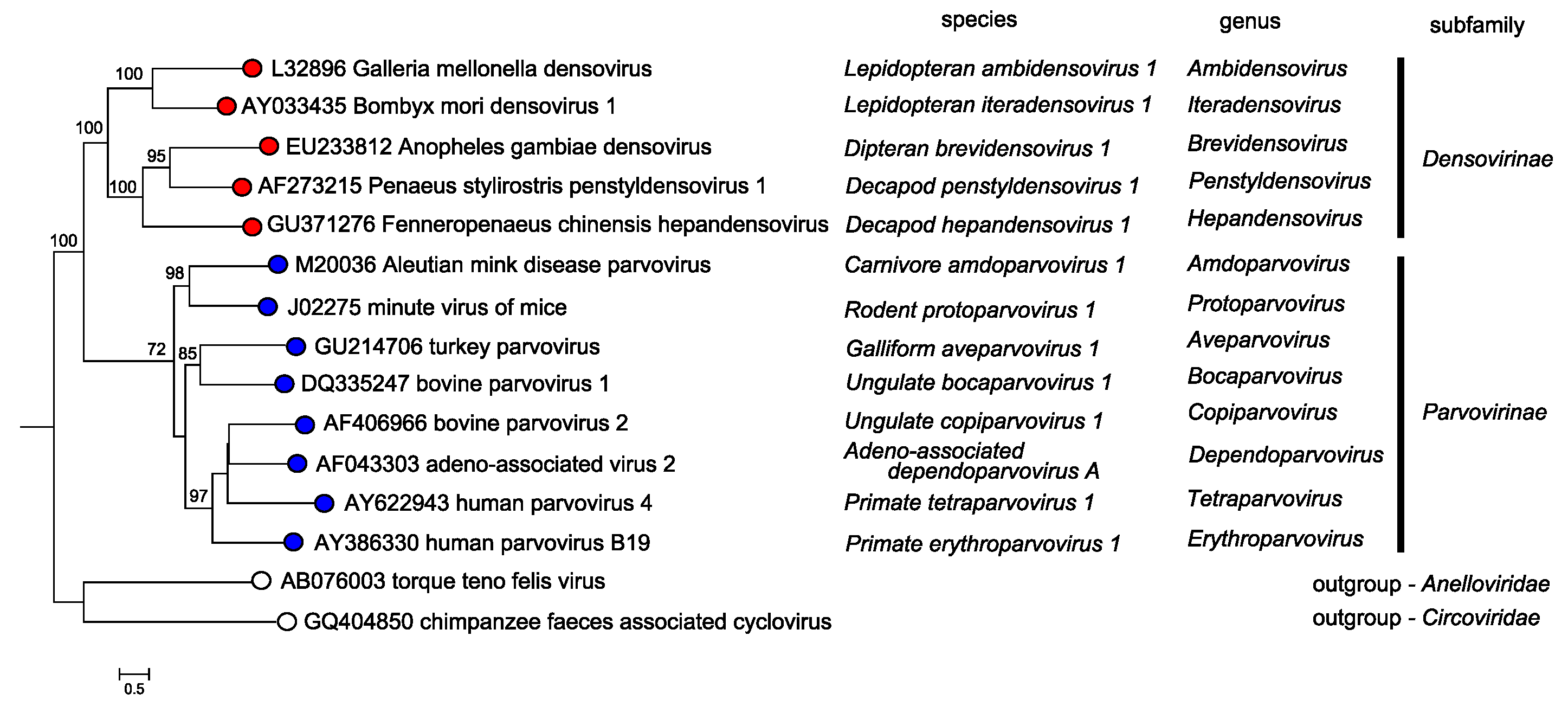 The two subfamilies, Parvovirinae and Densovirinae, are distinguished primarily by their ability to infect vertebrate versus invertebrate hosts, respectively; a distinction that is generally supported by Bayesian phylogeny of the NS1 protein sequence (Figure 5.Parvoviridae).