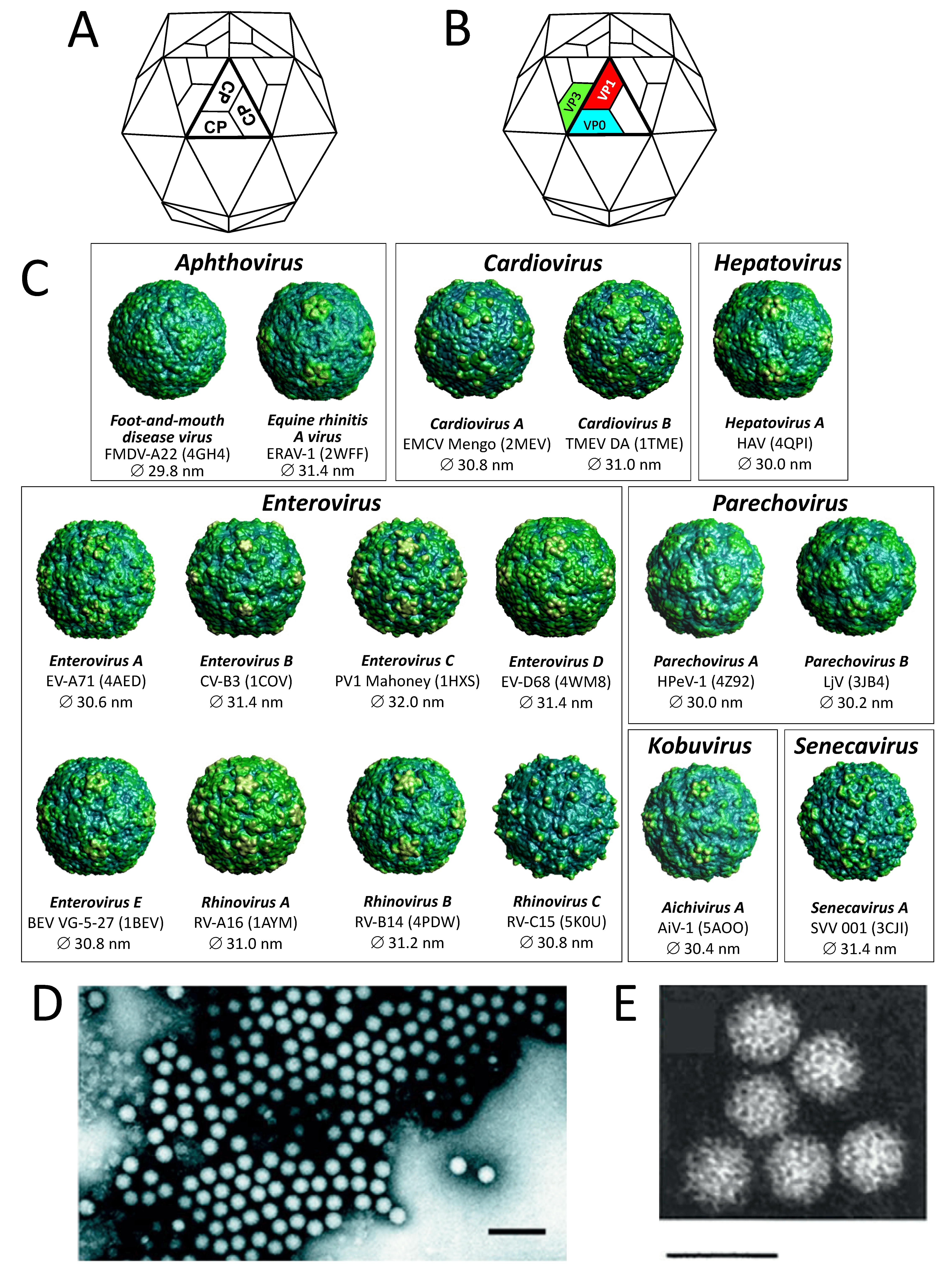 | Figure 1.Picornaviridae. (A) Schematic of the icosahedral T=3 capsid (small stellated dodecahedron). Each of the 60 facets comprises three protomers (protomer = one copy of the capsid protein CP) and matches with the crystallographic asymmetric unit (thick lines). (B) Schematic of the icosahedral T=1 pseudoT=3 capsid. The picornavirus protomer (comprising one copy each of the capsid proteins VP1, VP0, VP3) and the facets of the T=3 capsid are distinct. In fact, three protomers constitute one of 20 facets of the icosahedron (thus T=1). Where VP0 is cleaved, the fourth capsid protein (VP4) is located about the internal surface of the pentameric apex of the icosahedron. (C) Pictures of 17 picornavirus structures (from VIPERdb http://viperdb.scripps.edu (Carrillo-Tripp et al., 2009)). Indicated are genus, species, virus name abbreviation, PDB entry and the virion's average diameter. (D) Negative-contrast electron micrograph of poliovirus (PV) particles; the bar represents 100 nm (courtesy of Ann C. Palmenberg). (E) Negative-contrast electron micrograph of Aichi virus A1 (genus Kobuvirus) showing surface structure; the bar represents 50 nm (courtesy of Teruo Yamashita). |