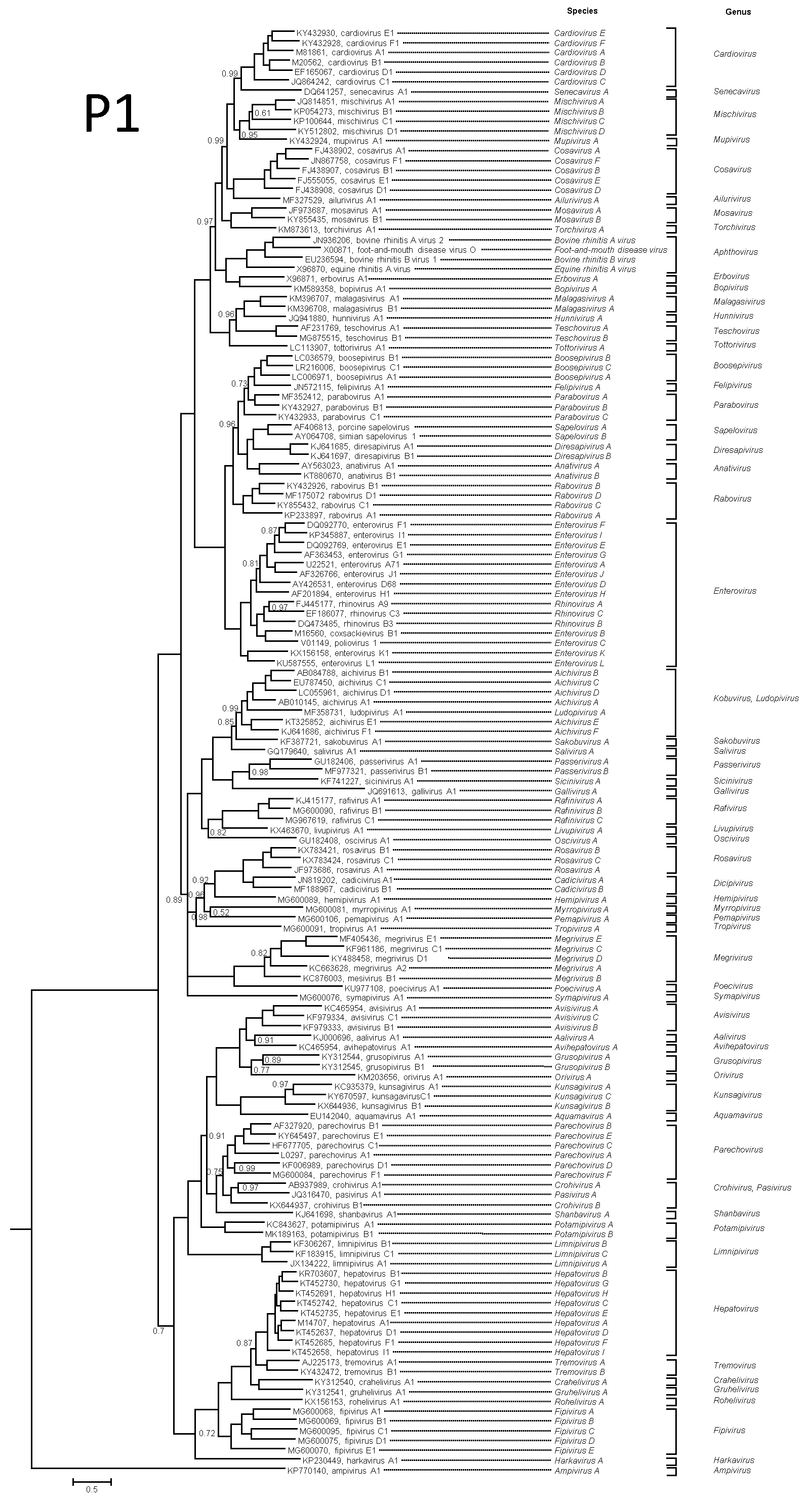 | Figure 4A. Picornaviridae. P1 protein phylogenetic tree showing the relationships between the classified members of the family Picornaviridae. For clarity, unclassified picornaviruses were not included. The maximum likelihood tree was produced with MrBayes using the GTR+G+I substitution model. The tree is rooted to the ampivirus outgroup. Tips are labelled with Genbank accession numbers and virus names. The taxonomy (species and genus) is shown to the right. Numbers at nodes indicate posterior probabilities obtained after 3,000,000 generations with values of 1 omitted. This phylogenetic tree and corresponding sequence alignment are available to download from the Resources page. |