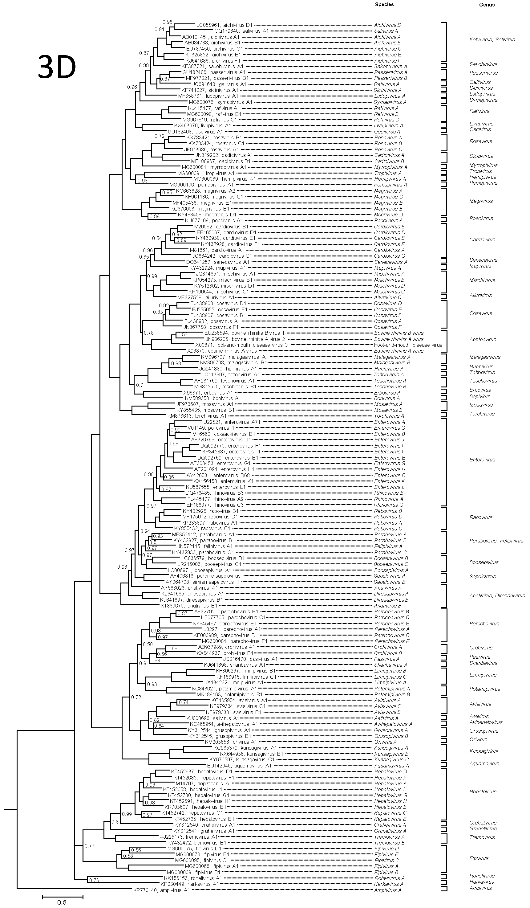 | Figure 4B. Picornaviridae. 3Dpol protein phylogenetic tree showing the relationships between the classified members of the family Picornaviridae. For clarity, unclassified picornaviruses were not included. The maximum likelihood tree was produced with MrBayes using the GTR+G+I substitution model. The tree is rooted to the ampivirus outgroup. Tips are labelled with Genbank accession numbers and virus names. The taxonomy (species and genus) is shown to the right. Numbers at nodes indicate posterior probabilities obtained after 2,200,000 generations with values of 1 omitted. This phylogenetic tree and corresponding sequence alignment are available to download from the Resources page. |