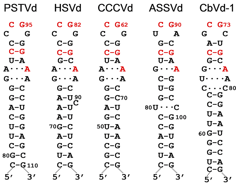 | Figure 2.Pospiviroidae. Hairpin I structures of typical members of species of five genera in the family Pospiviroidae. PSTVd, potato spindle tuber viroid; HSVd, hop stunt viroid; CCCVd, coconut cadang-cadang viroid; ASSVd, apple scar skin viroid, and CbVd-1, Coleus blumei viroid 1. Red fonts indicate conserved nucleotides in structurally similar positions. Continuous and broken lines represent Watson-Crick and non-canonical base pairs, respectively. Adapted with modifications from (Gas et al., 2007). |