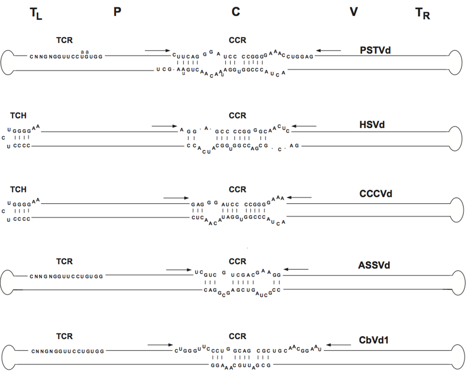Members of the family Pospiviroidae share their small size, circularity and rod-like secondary structure of the genomic RNAs with members of the family Avsunviroidae and with certain viroid-like satellite RNAs associated with viruses. However, the latter two groups of infectious RNAs contain ribozymes, which are absent in members of the family Pospiviroidae, and do not contain a CCR, TCR or TCH.