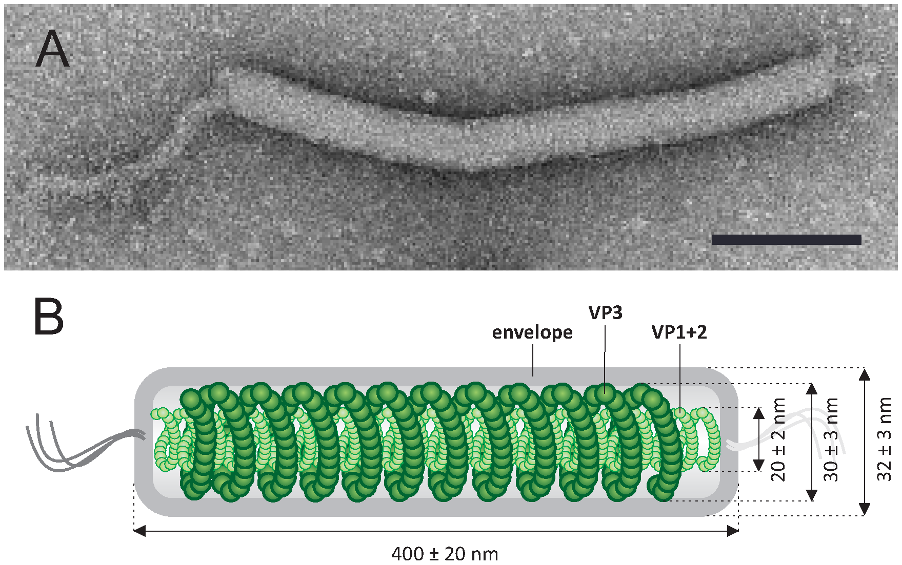 | Virion | Filamentous, flexible (400 ± 20 nm × 30 ± 3 nm) particle consisting of a nucleoprotein core covered by a matrix protein layer and enveloped with a lipid membrane; bundles of thin filaments are attached to both ends |