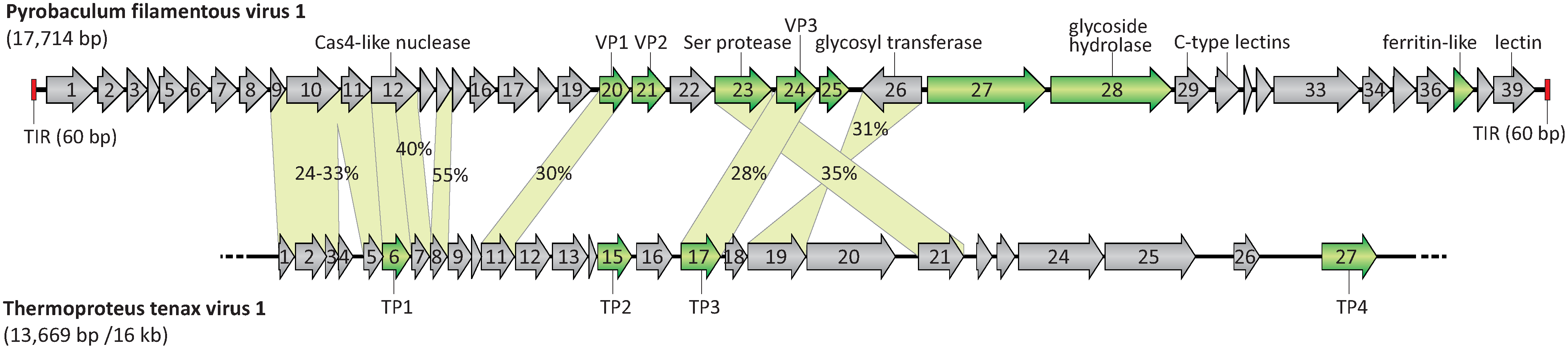 | Figure 2. Tristromaviridae. A genome map of Pyrobaculum flamentous virus 1 compared with the partial genome map of the virus Thermoproteus tenax virus 1. ORFs are shown by arrows, which also indicate the direction of transcription. Genes encoding the structural proteins are shown in green. Terminal inverted repeats (TIR) are depicted by red rectangles. The incompleteness of the Thermoproteus tenax virus 1 genome is illustrated by the broken line. TP: Thermoproteus tenax virus 1 capsid protein. The genes shared by both viruses are connected by green shading, and the identity between the corresponding proteins is indicated. Modified from (Rensen et al., 2016). |