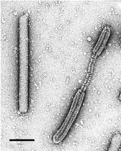 | Figure 3. Tristromaviridae. Electron micrograph of intact and partially deteriorated virions of negatively-stained Thermoproteus tenax virus 1, stained with 2% uranyl acetate. Scale bar, 100 nm. |