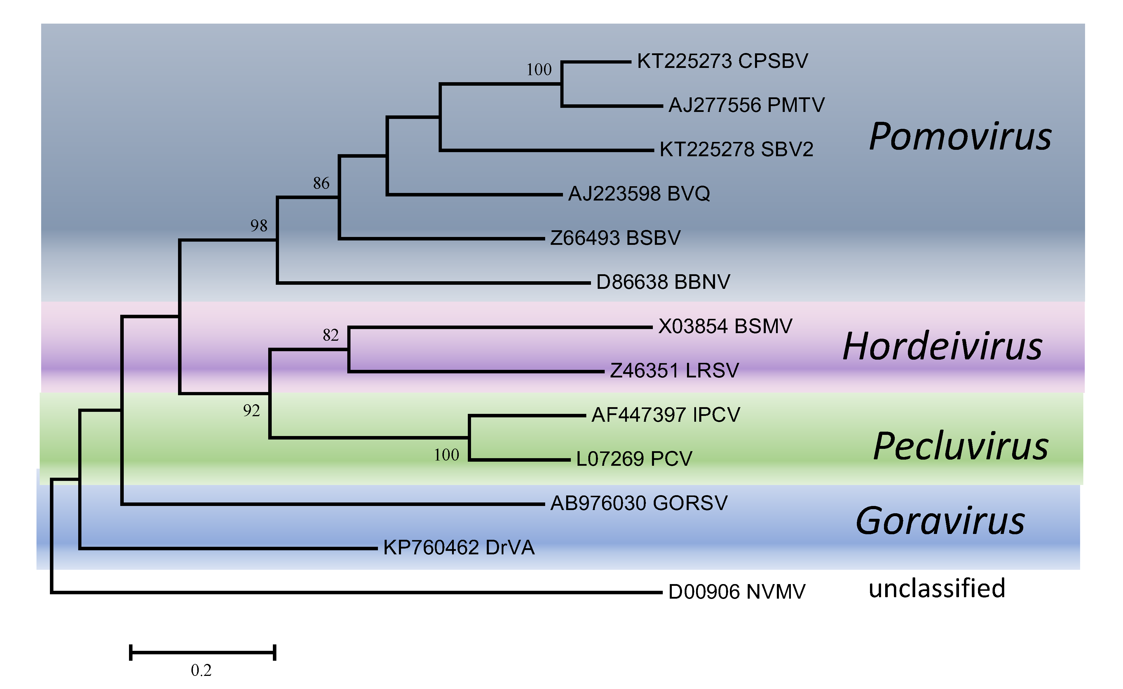 Phylogenetic trees obtained using the entire replication protein including the RdRP (or the conserved Mtr, Hel and RdRP domains) correlate well with genome organisation to support the existence of the different genera. However, these genera are usually reliably delineated, regardless of the protein used (Figures 1. Virgaviridae - 5. Virgaviridae). Using both the replication protein and the coat protein, the genus Tobamovirus separates substantially from the remaining genera. Furovirus and Pomovirus occur together on the same branch in all trees as do Pecluvirus, Goravirus and Hordeivirus.
