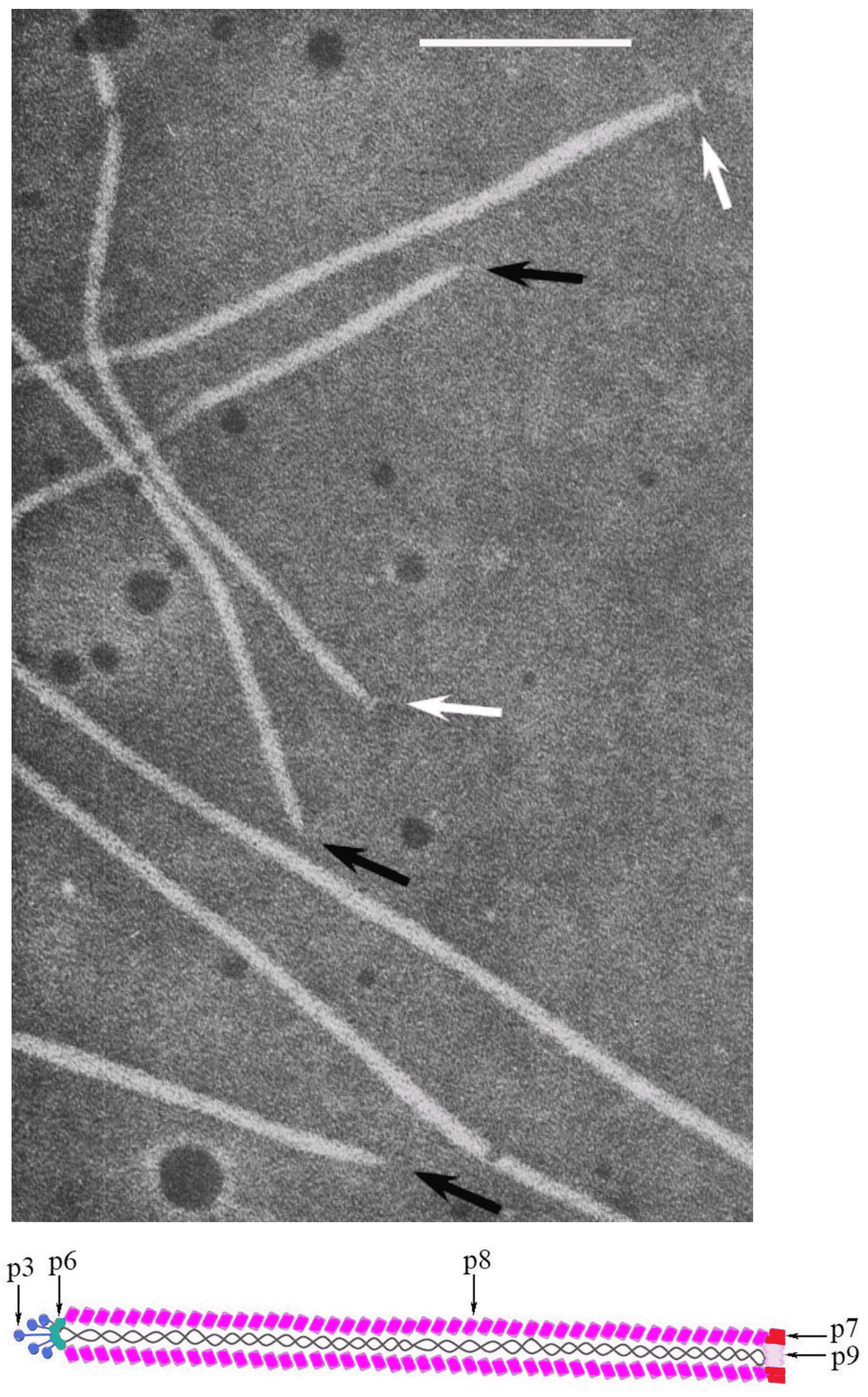 | Figure 1. Inoviridae. Virion structure of members of family Inoviridae: (Top) Negative-contrast electron micrograph shows a filamentous virion structure of a phage infecting enterobacteria; black arrows indicate pointed virion ends, while white indicate blunt ends. The bar represents 100nm (modified with permission from (Bradley et al., 1982); (Bottom) Schematic diagram of the virion Escherichia phage M13 (species Escherichia virus M13) |