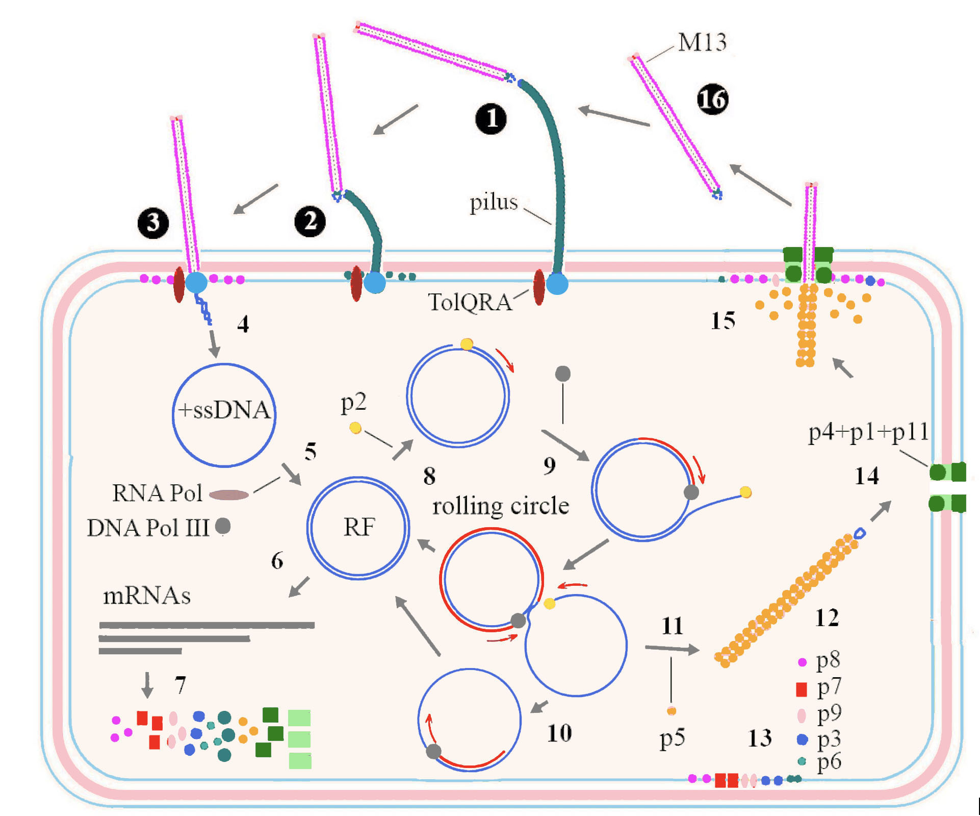 Among inoviruses, the replication cycle of M13 has been studied in most detail (Figure 3. Inoviridae). Infection starts when p3 interacts with the tip of a pilus on the bacterial surface (adhesion receptor) (1). This interaction triggers pilus retraction (2), bringing the phage closer to the bacterial cell surface, in proximity of TolQRA co-receptor (entry receptor) (Click and Webster 1998) (3). The phage (+) ssDNA genome is subsequently translocated into the bacterial cytoplasm and the capsid proteins are integrated into the host cytoplasmic membrane (4). The (+) ssDNA phage genome is converted to covalently bound dsDNA, the replicative form (RF), using a short primer generated by host RNA polymerase and the complementary strand of (-) ssDNA synthesized by activity of host DNA polymerase III (Geider and Kornberg 1974) (5). mRNAs are transcribed from the RF by the host RNA polymerase (6) and further translated by host machinery to produce the phage proteins (7). Translation involves the use of overlapping reading frames and alternate starts in the same frame. Replication of DNA starts when p2, which possesses endonuclease activity, nicks dsDNA at the origin of replication (Meyer et al., 1979) (8). The host polymerase then synthesizes (+) ssDNA from the complementary strand of RF by a rolling circle mechanism (9). The generated (+) ssDNA molecules are further converted into RFs (10) which are also used for transcription and more phage proteins are formed. Translated p5 has affinity to ssDNA and when its concentration is high enough, homodimers cover newly synthesized (+) ssDNA molecules (11). This inhibits further conversion of ssDNA into RFs and collapses DNA into filaments with an uncovered double stranded packaging signal at one end of the filament (12). The corresponding structural proteins integrate into the cytoplasmic membrane (13) along with the assembly proteins, these being a 14-mer aggregate of p4, plugged with p1 and p11 forming a pore for virion extrusion through the inner and outer membrane (Feng et al., 1999) (14). Virions are released by extrusion during the replacement of p5 with p8, the major coat protein (15). Proteins p7 and p9 are the first that extrude, followed by numerous copies of p8, while p3 and p6 are added at the end of the process and new virions are released into environment (16).