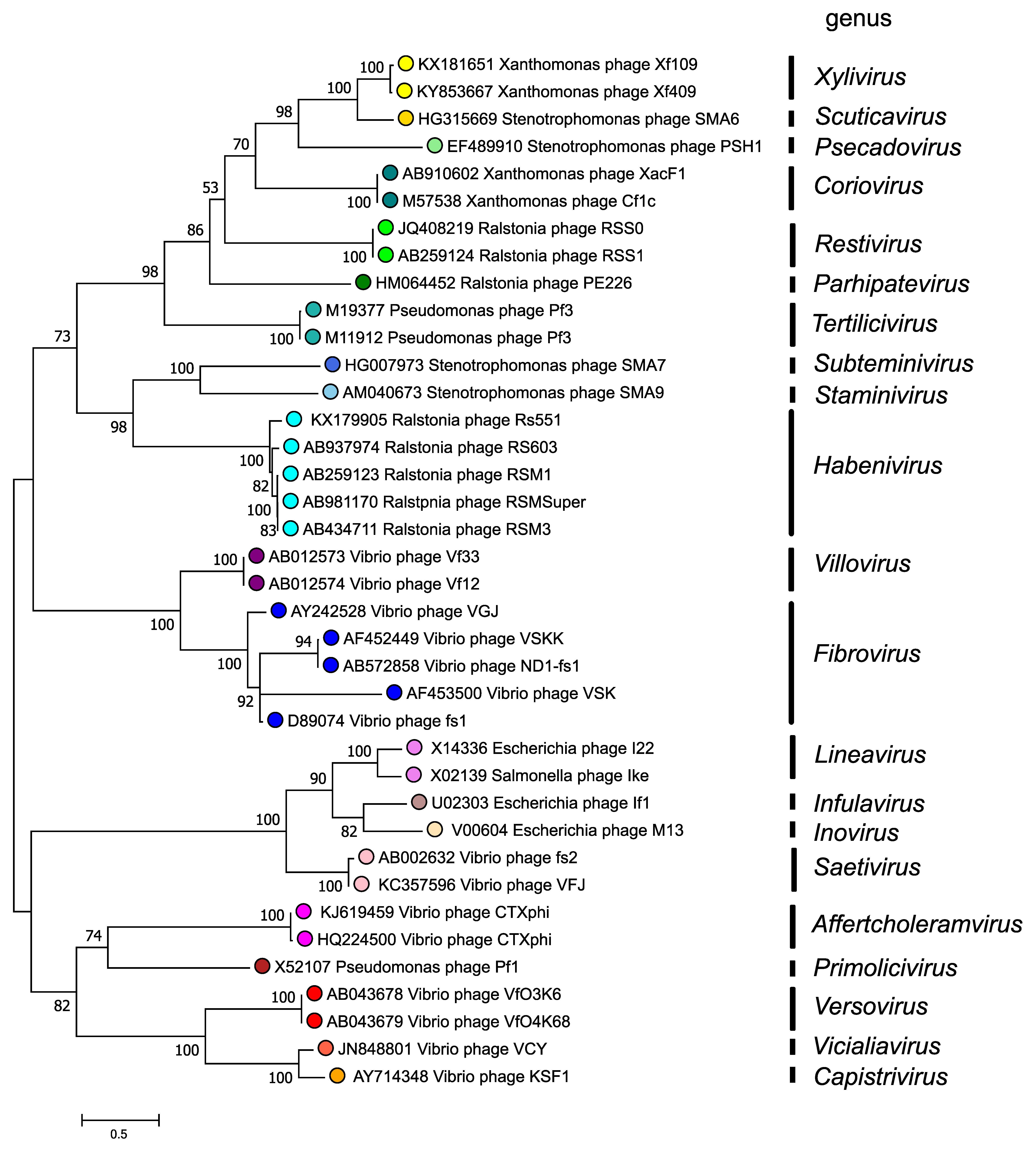 | Figure 4. Inoviridae. Phylogenetic relations of members of the family Inoviridae. Maximum Likelihood phylogenetic tree inferred using the Whelan And Goldman + Freq. model (Whelan and Goldman 2001) from a MUSCLE alignment of the full-length p1 (Zonula occludens toxin) sequences of 40 inovirids assigned to 21 genera. The tree with the highest log likelihood (-20779.30) is shown. Initial tree(s) for the heuristic search were obtained automatically by applying Neighbor-Join and BioNJ algorithms to a matrix of pairwise distances estimated using the JTT model, and then selecting the topology with superior log likelihood value. A discrete Gamma distribution was used to model evolutionary rate differences among sites (2 categories (+G, parameter = 6.0712)). The tree is drawn to scale, with branch lengths measured in the number of substitutions per site. This analysis involved 38 amino acid sequences. The percentage of 100 trees in which the associated taxa clustered together is shown next to the branches where this was > 50%. There were a total of 603 positions in the final dataset. The analyses were conducted in MEGA X (Kumar et al., 2018, Stecher et al., 2020). |