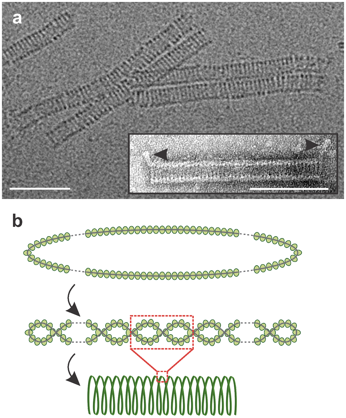 | Figure 1. .Spiraviridae. Virions of Aeropyrum coil-shaped virus. A. Electron micrographs of virions negatively-stained with uranyl acetate (in inset) and embedded in vitreous ice. Scale bars, 100 nm. B. Schematic representation of different levels of virion organization: the two halves of the circular nucleoprotein (top) intertwine with each other to form a filament (middle), which is condensed into the cylindrical helix of the virion (bottom). Modified with permission from (Mochizuki et al., 2012). |