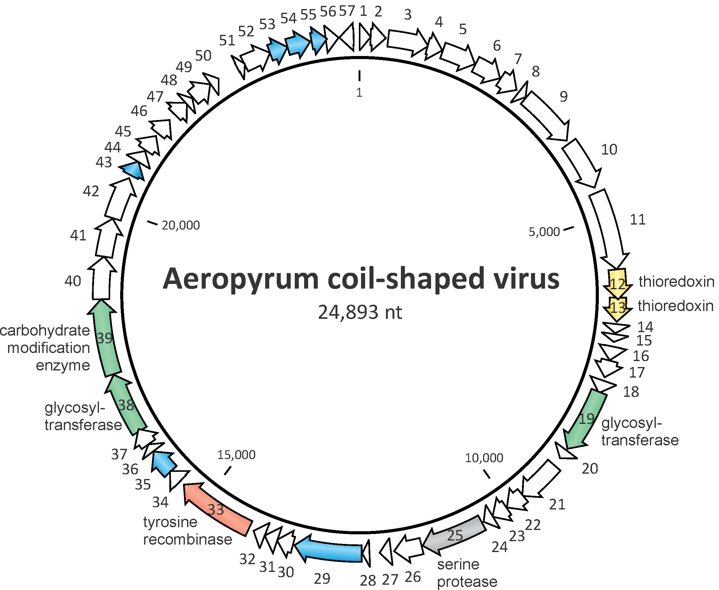 | Figure 2. Spiraviridae. Circular genome map of Aeropyrum coil-shaped virus. The open reading frames (ORFs) are marked with arrows indicating the direction of transcription. The ORFs encoding putative proteins for which functions could be predicted are color-coded and labeled on the figure; blue arrows represent ORFs encoding DNA-binding proteins. |